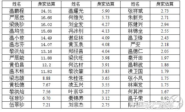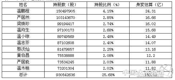 之后溫鵬程等11位發起人及家族成員注資,2015年10月30日時溫氏股份的總股本數增至3625247380股,45位自然人的持股比例區間變更為0.042%-4.15%。按照每股16.15元的發行價計算,45位發起人中除了陳樹漢(0.25億)、溫子榮(0.92億)之外,其余的43名發起人身家均超過1億元。