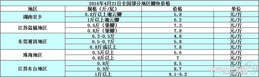 文/圖 中國水產頻道 張靜 中國水產頻道原創報道,4月初至今珠三角地區降雨頻繁,導致草魚的飼料投喂量大大減少,草魚生長速度減緩,現在珠三角地區可供上市的草魚存塘量少,整體魚價處于穩定上漲的趨勢。湖北地區合規格上市的草魚存量也不多,近期部分養殖戶準備投放草魚夏花苗,但不同地區的養殖情況也不一樣,例如湖北荊州地區的草魚成魚5月初可以開始上市;湖北團風地區的部分草魚成魚在5月底到6月初可以上市,多數成魚還是要等到7月中旬才會集中上市。4月21日各地草魚塘邊價如下: 鯽魚因市場消費需求高,加之各地的鯽魚存塘量少,所以近期各地的鯽魚價格都比較高漲,特別是江蘇東臺地區1斤以上/尾規格的鯽魚塘邊價可以賣到9.1-9.2元/斤,但這種大規格鯽魚的存量非常稀少,多數存塘鯽魚的規格還是在0.8-0.9斤/尾。4月21日各地鯽魚塘邊價如下: 因“黃顙魚染色”的謠言報道直接導致了黃顙魚的市場銷量跌入谷底,各地黃顙魚價格也因此大起大落,例如3月底佛山地區0.3-0.4斤/尾規格的黃顙魚塘邊價可以賣到13元左右/斤,現在4月中旬的價格只有10.5元/斤,20天左右的時間魚價下跌了2.5元/斤,價格跌幅非常明顯。4月21日各地黃顙魚塘邊價如下: 【關鍵字】: 草魚 鯽魚 黃顙魚 水產養殖 中國水產頻道原創報道,轉載請說明出處 中國水產頻道 www.fuqitext.com ,違者追究法律責任, 謝謝合作。 |