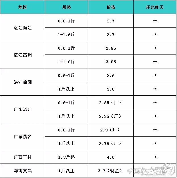 中國水產頻道報道, 南美白對蝦 羅非魚 其他水產品 行情分析 暑期小旺季來臨,白蝦需求量增大,低迷的白蝦市場有了復蘇的跡象。在中堅消費市場的拉動下,白蝦價格行情穩中有漲,預計高位池蝦在未來一周時間左右會有0.5-1元升幅;因土塘蝦因存量較大,價格變化不大。 羅非魚方面,價格已經跌到見底,估計也不會再有跌幅。近期,加工廠雖然有作調整,但也不值得樂觀,預測未來一周內,羅非魚行情變化不大。 連日來,土塘金鯧魚價一路下跌,在未來的一段時間,低迷的行情依然難有起色。與此同時,網箱養殖0.7斤以上/尾的金鯧魚目前價格行情雖然能維持在相對較高水平(15元/斤),但到了本月底,早批新魚上市,屆時行情也不容樂觀,預測會有0.5-3元/斤的跌幅。朋友們,要密切關注啊! 以上僅供參考! |