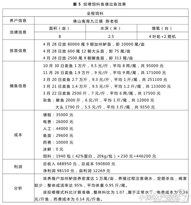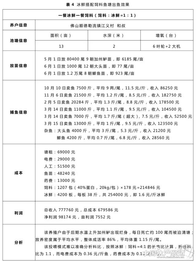 文/廣州市誠一水產科技有限公司黃樹華 調查背景 中國水產頻道報道,佛山市位于廣東省中南部,地處珠江三角洲腹地,東靠廣州,南鄰港澳,地理位置優越,交通發達。佛山氣候溫和,雨量充足,屬亞熱帶季風性濕潤氣候,自古就是富饒的魚米之鄉。珠江水系中的西江、北江及其支流貫穿全境,為佛山的淡水養殖提供無可替代的天然條件。 加州鱸分類學上屬鱸形目、太陽魚科、黑鱸屬;喜歡棲身于沙質或沙泥質不混濁的靜水環境中,活動于中下水層,性情溫馴。原產美國加利福尼亞州密西西比河水系,是一種肉質鮮美、抗病力強、生長迅速、易起捕、適溫較廣的名貴肉食性魚類。佛山市于1983年引進加州鱸魚苗,并于1985年相繼人工繁殖成功。經過30多年的發展,佛山已經成為我國無可爭議的加州鱸養殖和飼料發展的核心地帶。 佛山加州鱸養殖市場長期以投喂冰鮮為主,而最近兩年飼料的成功推廣無疑使佛山加州鱸成為養殖行業和各大飼料廠家關注的焦點。據不完全統計,2015年飼料總量接近4萬噸,飼料使用率大概占市場20%。未來幾年加州鱸養殖是否會跟生魚一樣,完全由投喂冰鮮轉為投喂飼料呢?全程投喂飼料是否會造成其它問題?養殖模式是否會隨著飼料的使用而發生轉變?這些問題都需我們進行調查和探討。 養殖模式 2.1池塘條件 佛山地區的魚塘一般為比較規則的長方形或正方形的土塘,面積多數為6~10畝,水深1.8~3.0米不等,以西、北江河為水源補給,水源充足,排灌方便。每1~1.5畝配備一臺葉輪式增氧機,池塘清理常用漂白粉消毒,生石灰調節酸堿度穩定水體,最后用茶麩或興棉寶殺滅野雜魚。 2.2養殖規模 順德區和南海區是佛山加州鱸養殖最集中的區域,同時也是全國加州鱸養殖規模、飼料容量最大的區域,其養殖面積占全國加州鱸養殖面積約30%,但養殖產量占全國養殖總量的65%以上。具體養殖情況詳見表1。 2.3放養模式 佛山加州鱸養殖均為精養模式,并套養一定量的鯽魚或黃顙魚作為底層魚清理殘餌,套養鳙魚調節水質。由于塘租的差異,順德地區的放養密度普遍高于南海地區,且不同的養殖戶套養的品種和比例略有不同。投喂冰鮮的魚塘由于冰鮮碎屑及部分沉底物可供底層魚類利用,所以套養底層魚相對較多;而投喂飼料的魚塘由于鳙魚會影響加州鱸攝食故不能多放。 下面列出冰鮮與飼料投喂加州鱸精養模式,詳見表2、表3。 養殖戶所用的魚苗基本上來自有“中國加州鱸孵化場”美譽的南海區九江鎮。其中為了節省成本,部分養殖戶會在2~3月間購買當地大約30~40元/萬尾的水花苗進行培育,或選用3~4朝的魚苗進行標粗馴化,當地俗稱“飛機苗”。由于這個時期的魚苗會出現大吃小的現象且生命力不強,易受天氣、水溫、環境等條件影響,成活率難以估算,因此表2和表3均以魚苗生長穩定至7~9朝、拆網全塘養殖為放苗標準,折算魚苗成本為0.3元/尾。 2.4養殖周期 由于加州鱸4月份便進入排卵期,此階段部分加州鱸會出現產后感染死亡的現象,且產后也會出現掉膘、吃料不長的情況,從而增加養殖風險,降低養殖效益;雖然5~8月份魚價較高,但大部分養殖戶都會選擇在4月前清塘;也有個別養殖戶賭高魚價,堅持養到7、8月份再賣。因此養殖周期根據養殖習慣可分為頭批、中批、尾批三種。 頭批模式:1~3月放苗,勤喂料,追求生長速度,希望9月份的頭批魚夠大、比例高,頭批普遍為5~6兩起捕;該模式多數在年前清塘,在順德地區此模式比例較高,其中以杏壇鎮最為突出。 中批模式:此為市場主流養殖模式,4~5月放苗,5~6月分塘,11~12月出頭批魚,來年3~4月清塘。 尾批模式:該模式4~5月放苗,9月份養殖至3~4兩才分塘,一般春節前后出頭批魚,過冬及排卵后期控制投餌量,來年7~8月份清塘;該模式以南海沙頭地區最為常見。 2.5投喂習慣 投喂通常分為馴化標苗期和成魚投喂期兩個階段。 馴化標苗期:3~6朝的魚苗主要投喂水蛛(枝角類為主),7朝左右開始喂死水蛛搭配0號粉料,接著搭配0號破碎料,9朝以上開始轉喂1號料。為了使魚苗長勢均勻,避免大吃小現象,馴化階段全天不間斷投喂。 成魚投喂期:分為冰鮮投喂、冰鮮搭配飼料投喂和飼料投喂三種方式。根據魚的大小每天投喂2~5次,投喂量根據魚的攝食情況以及天氣、溫度等來具體決定,越冬魚每天投喂1次。順德地區養殖戶以冰鮮投喂為主,南海地區養殖戶更多以冰鮮搭配飼料投喂。 ①冰鮮投喂:佛山地區所使用的冰鮮大多來自珠江口、廣西北海、茂名電白、越南(封海期)等地。養殖戶從冷庫獲得冰鮮,經切割、破碎等方法讓冰鮮達到適口大小進行投喂。 ②冰鮮搭配飼料投喂:這是目前佛山大多養殖戶選擇的投喂方式,而且可以分為前期飼料后期冰鮮和一餐冰鮮一餐飼料兩種模式。前期飼料后期冰鮮模式主要是因為8月前封海時期冰鮮價格較貴而誕生,投喂方式為封海期投喂飼料,解禁后改用冰鮮投喂。一餐冰鮮一餐飼料的模式多數為早上喂冰鮮,下午喂飼料。 ③飼料投喂:一般每天2~5次,投喂量根據魚的攝食情況以及天氣、溫度等來具體決定。 2.6起捕模式 佛山地區起捕規格通常為8兩,而9~10月的頭批魚魚價較高,起捕規格5~6兩以上。起捕時間與次數根據市場價格、魚的規格大小等情況略有不同;大部分的起捕次數在1~3次之間。 起捕方式主要分兩種:一是分次出魚,將規格較大的魚賣掉,規格較小的繼續養殖,該模式可降低魚的密度保證魚體的平