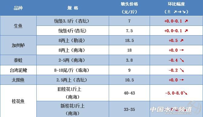 ◦本文為水產前沿和珠海海龍聯合報價欄目 養好魚,更要賣好魚 珠三角地區最新魚價行情一手掌握 草魚:2-5兩和3-7兩草魚種一苗難求;大草魚價格上漲 1-3兩的草魚種目前市場上開始大批量供應,目前價格會相對穩定,后期價格應該會滑落。2-5兩和3-7兩的市場存塘量少,一苗難求,價格會持續走穩,但上漲空間不大。另外目前存塘的統鯇偏少,進塘的規格魚種也少,導致統鯇的價格還會持續緩慢攀升。大草魚受限于市場存塘量少,價格依然會往上走;脆肉鯇在新脆出來之前價格依然會略有上漲,總體行情利好。 黃顙魚:存塘量、運輸量、出魚量均減少 黃顙魚存塘量少,高溫期由于運輸量少,客戶出魚量也減少,價格相對穩定。 無鱗魚類 海水魚:鱸魚價格全面上升 鱸魚水車和鱸魚大冰價格全面上升,后市繼續看好。盲曹價格較好,黃花,立魚價格下行。 其他魚類 最新價格行情如下表格 淡水特種魚 其他魚類 |