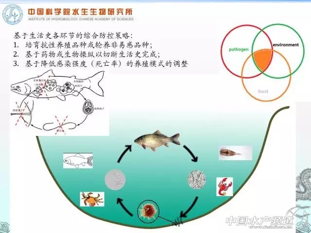 中國水產頻道周雙艷整理,原作者:中國科學院水生生物研究所章晉勇博士 水產前沿微信課堂升級了 在這里還要告訴大家一個好消息:水產前沿微信課堂升級了! 第一是你隨時隨地都可以進直播間看講課的內容,不用擔心會錯過進去之前的內容; 第二是它沒有人數限制,只要你想聽就都沒有問題; 第三當你聽到嘉賓講得好時可以隨時給嘉賓打賞。 中國水產頻道報道,7月29日晚上19:30-21:30,中國科學院水生生物研究所章晉勇博士做客中國水產頻道,將他在孢子蟲方面多年的經驗跟大家進行了分享。章博士分享的內容包括孢子蟲基礎生物學簡介、研究歷史、寄主、生活史、感染與傳播機制、科學防控策略、當前常見的粘孢子蟲簡單介紹以及關于當下和未來寄生蟲病害防控的幾點思考。小編節選一部分關于孢子蟲防控和防控的幾點思考的內容分享給大家,看看自己的防控水生動物孢子蟲的過程中是否也存在著一些誤區和錯誤觀念。對其他部分感興趣的朋友們請點擊【閱讀原文】自行學習吧!全文一共有11000多字,建議大家收藏起來慢慢學習。 孢子蟲的防控策略 1、科學防控的基礎 防控的基礎是三圈理論,即病原(孢子蟲)、宿主(水蚯蚓、魚)和養殖的水環境。 防控首先要找到它的薄弱環節,①能否能夠控制池塘里面的水蚯蚓,②找到水蚯蚓什么時候釋放放射孢子蟲,也就是感染源,然后把這個兩個直接把它掐斷,放射孢子接觸不到魚就不會發生感染了。 2、如何從寄主方面進行防控呢? 粘孢子蟲有脊椎動物宿主和無脊椎動物的宿主,從防控的角度講的話,怎么樣從脊椎動物和無脊椎動物宿主進行防控呢? 從脊椎動物宿主來講: ①培養抗粘孢子蟲的宿主。例如鯽魚的中國3號,當時中國3號能夠抗腹孢子(吳李碘泡蟲)。這個工作確實是在同一個池塘里面經過驗證的(沒有在感染平臺上驗證),同一池塘里面放了高背鯽和中國3號,發現高背鯽的感染率很高,中國3號的感染率非常低,這可以說明中科3號能夠在一定程度上抵抗腹孢子蟲,但不是100%的,因為任何的抗性品種如果感染源的豐度高非常了也是抵抗不住的。 ②混養,輪養。一些非特異性宿主會消降池塘里面感染源放射孢子蟲的豐度。如果是輪養的話,休耕是最好的方式。因為休耕,池塘里面可能就不會有水蚯蚓,即使有水蚯蚓它也會把池塘里面遺留的粘孢子蟲吃光,如果找不到易感宿主,那么它的世代就完成不下去,自然也就滅亡了。 ③免疫增強劑。我沒有做過具體的實驗,我不知道到底有沒有效果,但是我估計是有效果的,因為免疫增強劑是提高機體免疫力的。如果真是做了這方面實驗,推薦了這個東西,我建議在當下養殖條件下還是用一些,因為也不是太貴,,既可以抑制寄生蟲,又可以提高機體的免疫力。 從無脊椎動物宿主來講: ①底質的改造。從研究的角度來講,養殖戶不可能進行池塘底泥的改造,我們都知道養殖戶池塘的底泥都不會去清理的,更不用說底泥的改造了。但對培育觀賞魚的,底泥改造還是可行的。如果是沙質的底,蘇氏尾鰓蚓這種比較大的水蚯蚓在沙子里面容易斷而死亡。 ②用藥物殺滅。比如用殺釘螺的藥去殺水蚯蚓,清塘的時候生石灰和二氧化氯是有用的。 ③生物操控。蝦蟹能夠吃掉水蚯蚓,也是可以用的。我不建議殺水蚯蚓,因為它是池塘生態系統的一部分,對生態系統的穩定性是有用的,如果你能夠把一些抗孢子蟲的物種放進去,一來可以預防發病,二來能夠更好維持池塘生態的穩定性。 ④抗病品系的培育。這點可以查閱桂建芳院士的相關研究。 3、如何從病原的層面進行防控呢? ①不同毒力株對宿主的致病力差異 研究發現不同的水蚯蚓有不同的基因型,不同的基因型抗某種孢子蟲的能力不同。同一種的孢子蟲對不同地域來源的鯽魚的毒力也不一樣。這是我們國家還沒發現,因為我調查了十幾個省份的喉孢子蟲,發現我們用的標記是沒有差異的,也就是說是沒有毒力差異的。美國人在鮭鱒魚里面發現不同的基因型孢子蟲對鮭鱒的毒力是不一樣的,致死率也不一樣。 ②非易感無脊椎動物宿主的引入 不同基因型的水蚯蚓對粘孢子蟲的抵抗力也是不一樣的,左邊有放射孢子蟲,右邊是加了抗性的水蚯蚓,它對不同樣的粘孢子蟲抵抗力是不一樣的。 ③苗種的嚴格檢驗檢疫,SPF苗種的培育 苗種的檢驗檢疫是非常重要的,我們國家早就規定了苗種的跨境檢驗檢疫是必須要做的,但是沒有人去做這個事。一個很重要的防控方法就是要做SPF標苗。 我們在蘇北做了這么多年,有些塘口確實是一條水蚯蚓都沒有,但它為什么得病呢?有兩個原因:第一個原因水源傳播,從別的塘口帶來的。第二個原因苗種帶來的,因為喉孢子、腹孢子傳播時間非常的長。當然跟溫度也有關系,溫度不一樣,發育的快慢也就不一樣。 所以我大致分了一下,有水蚯蚓的塘口叫做內源性塘口,能夠維持整個生活史的周期。水源和苗種帶來的感染源的塘口叫做外源性塘口。 SPF苗種對外源性塘口是非常非常有效的防治方法,甚至一點藥物都不用。如果你是外源性塘口,喉孢子蟲病你一點藥物都可以不用,在水源口加上一個沙濾或者UA消毒,就可以用來控制水源的傳播。 ④藥物滅活感染源或阻斷成熟孢子發育 如果水里面的水蚯蚓和放射孢子蟲沒有控制住,那么這個時候我們就只能用藥物阻斷感染,然后水里面的放射性孢子蟲我們現在有一種藥物(當然現