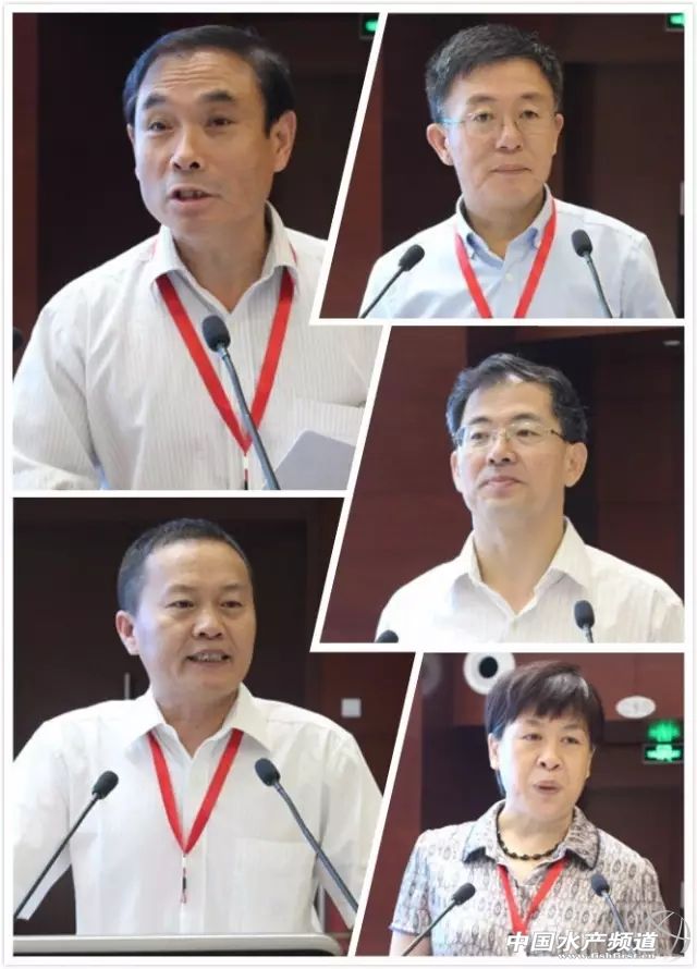 左1:農業部漁業漁政管理局李書民副局長 右1:中國水產科學研究院黃海水產研究所金顯仕所長 左2:中國水產流通與加工協會崔和常務副會長 右2:中中國水產科學研究院副院長劉英杰 右3:山東省海洋與漁業廳傅日新副廳長