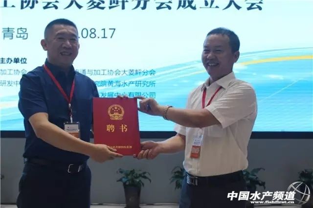 中國水產流通與加工協會常務副會長崔和向青島藍色糧倉科技發展中心有限公司總經理雷東頒發會長聘用證書