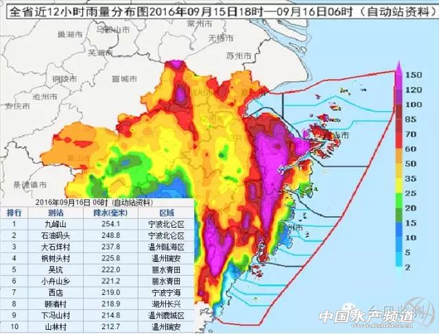 浙江省自動站12小時雨量分布圖及全省自動站降水量排名前十的站點及降水量數據(9月15日18時到9月16日06時)