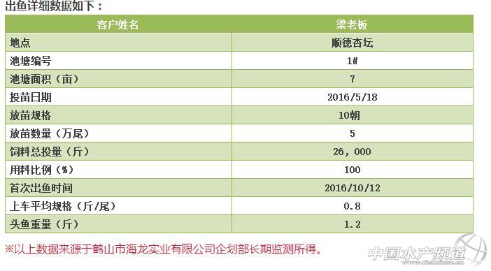 | 文/圖 鶴山市海龍實業有限公司 中國水產頻道報道,受到上半年天氣以及病害的雙重影響,今年珠三角地區的加州鱸頭批魚上市時間有所延遲。在9月中下旬,才有個別頭批魚開始出塘。一直到國慶前后,珠三角地區的加州鱸養殖,才真正迎來一個頭批魚出魚小高峰。順德杏壇客戶梁老板于10月12日開捕頭魚,成績出乎意料,原本6兩起抓,結果平均上車規格全部超8兩,其中炮頭1.2斤。 梁老板整個養殖過程全程使用鶴山市海龍實業有限公司(以下簡稱“鶴山海龍”)的“龍之品加州鱸配合飼料”,他對鶴山海龍的高魚粉、低淀粉的飼料定位信心滿滿,抵制住了低價冰鮮的誘惑,堅持走全程喂料,科學養魚的道路。在整個養殖過程鶴山海龍的技術人員定期拜訪,及時與梁老板作溝通交流,使得整個養殖過程非常順利,期間多次打樣,魚的肥滿度、肝臟健康度都表現良好,再加上10月12日開捕頭魚的效果,令梁老板更加堅定了全程喂料的信念,對公司的“龍之品加州鱸配合飼料”表示認可。下面是這次出魚的詳細情況。 肥碩的魚兒 魚背色澤翠綠,體型修長 魚體活力好,耐運輸 出魚詳細數據如下: 魚體色澤好,體型靚 背肉厚 肝臟健康,無脂肪肝 【關鍵字】:加州鱸 全程飼料 水產養殖 |