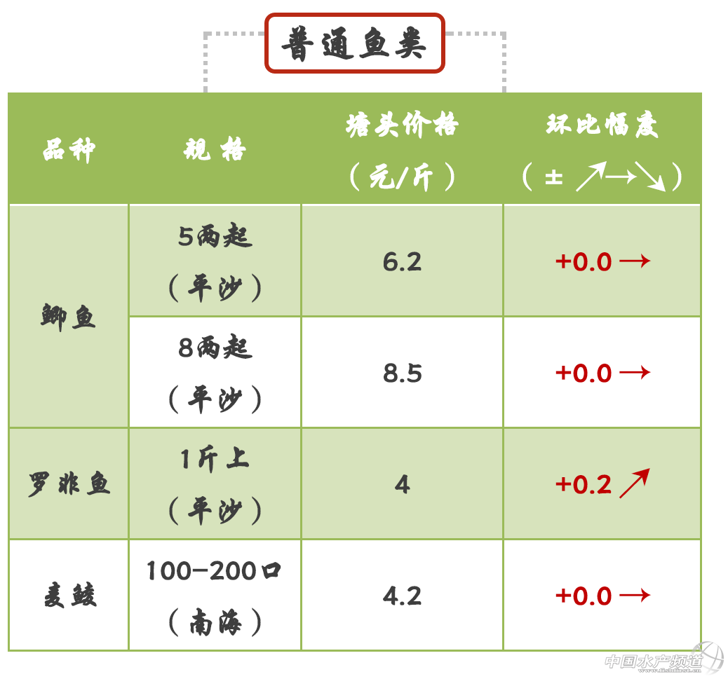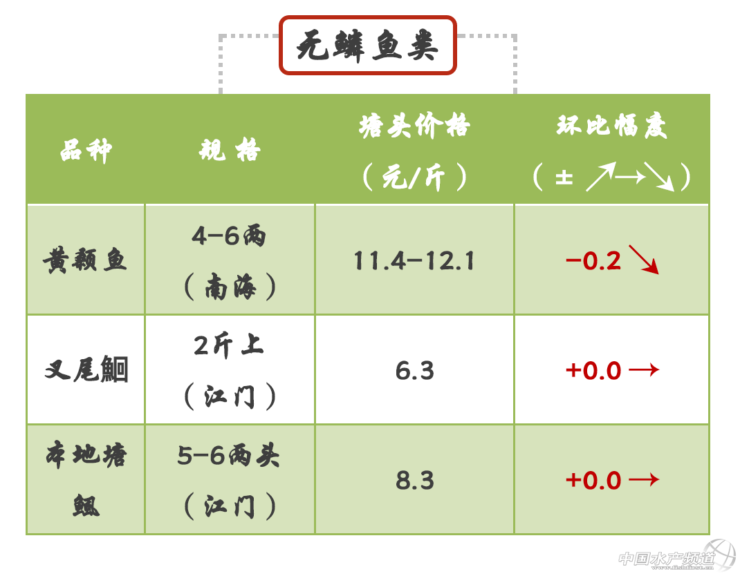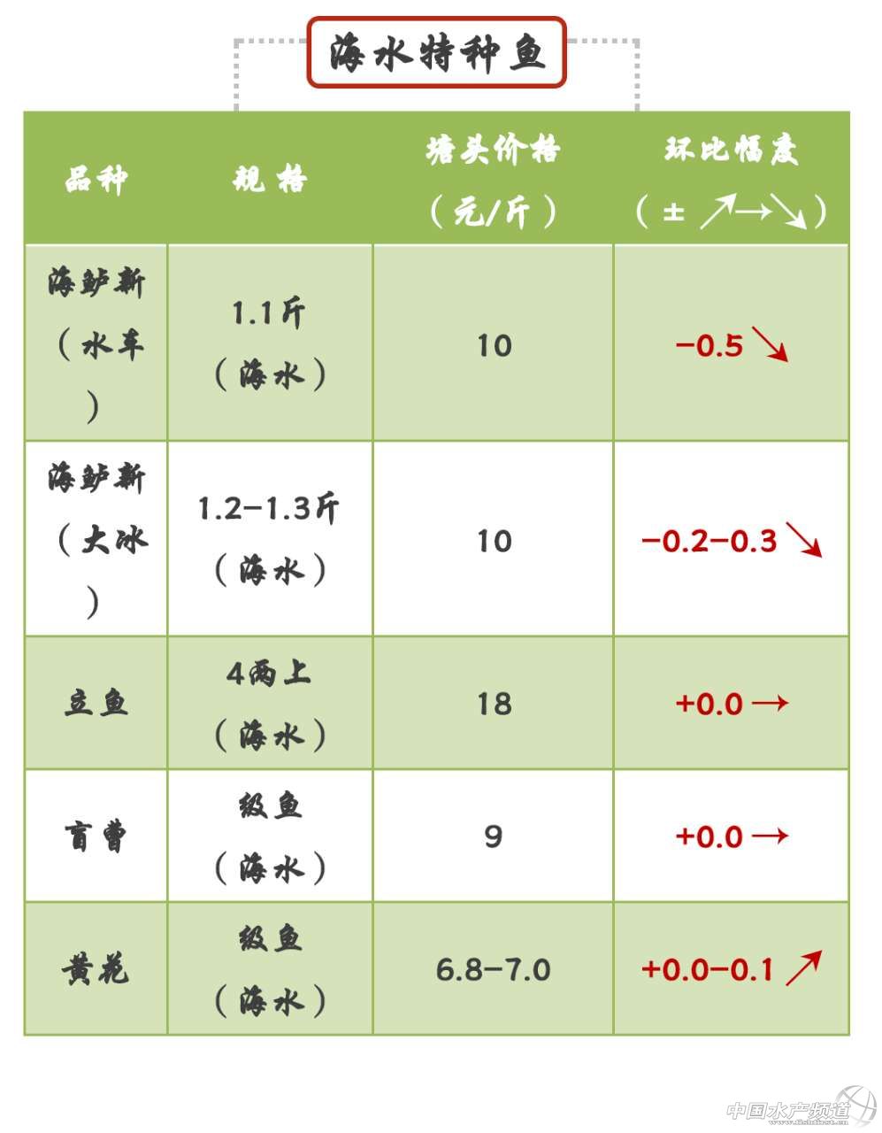 | 中國水產頻道獨家報道, 本文為水產前沿和珠海海龍聯合報價欄目 養好魚,更要賣好魚 珠三角地區最新魚價行情一手掌握 草魚 北運流通開始,價格將會有所上漲 草魚種、超市魚和大草魚的行情比較低迷,流通比較慢,但是北運的流通開始慢慢運轉起來,1-3兩的草魚種需求量開始增加,另外由于季節帶來消費結構的改變,小規格的超市魚需求量大,后市會上漲。脆肉鯇的價格小幅度下跌,市場供應量比較足。 草魚上市將迎來高峰期,往后草魚和超市魚會慢慢起來的,F在的北運的魚主要是往福建江蘇一帶,然后預計這個月中旬湖南湖北那邊的板塊也開始流通,很多魚中開始收魚,對魚品要求相應來說比較嚴格,所以現在走的量還不大。 黃顙魚 出魚數量逐漸增多,后市看好 黃顙魚舊魚存塘量少,舊魚客戶選擇出魚逐漸增多,受供求關系影響,價格維持相對穩定。 海水魚 新魚魚價較好 隨上市魚增多,新魚魚價行情有下行趨勢,但價格仍較好。跟去年相比,雖然現在新魚多了,魚價有所下跌,但是下跌的幅度沒有那么快。然后現在目前加州鱸六兩是9塊7毛,八兩是11塊。整體行情是比去年好,去年這個時候8兩規格的魚,已經掉到9塊多了。 現在出魚也主要是出8兩的魚。今年的舊魚存塘量很少,現在主要是以新魚為主。盲曹,黃花,立魚價格穩定。 其他魚類 最新價格行情如下表格 ※上述報價可能會因區域、規格、品質和時間等因素的不同而會產生差異,在此僅供參考。 【關鍵字】:草魚 鯽魚 黃顙魚 加州鱸 水產品價格 水產養殖 |