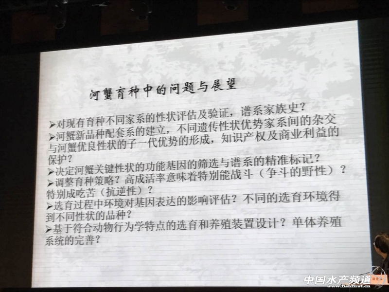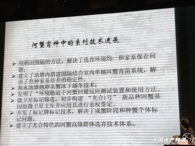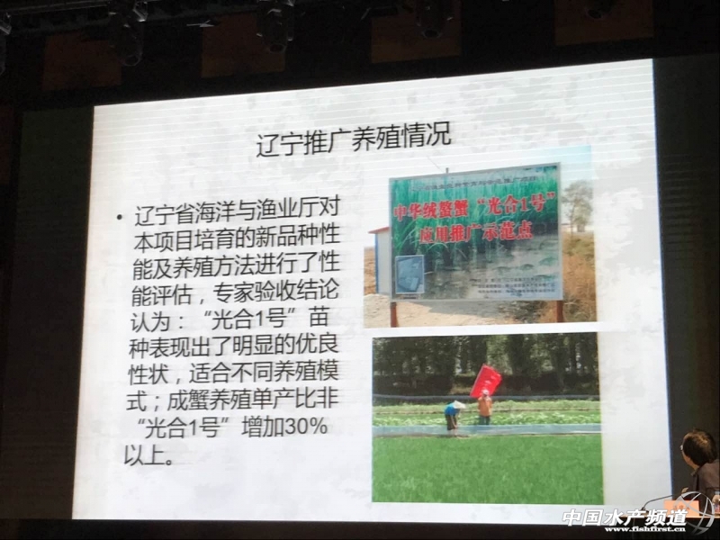 | 中國水產頻道報道, 報告主題:河蟹新品種選育的實踐及展望 報告嘉賓: 李曉東教授(沈陽農業大學/盤錦光合蟹業公司) 此PPT來自于2016年中國河蟹產業發展高峰論壇