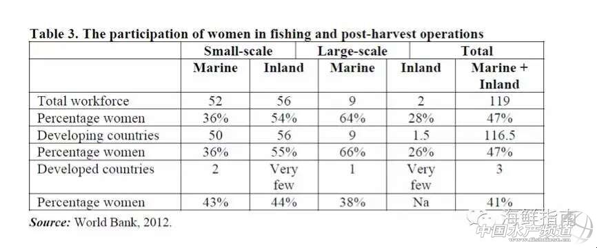 中國(guó)水產(chǎn)頻道報(bào)道,從南到北,從沿海到內(nèi)陸,從發(fā)達(dá)國(guó)家到發(fā)展中國(guó)家,如今的捕撈漁業(yè)和水產(chǎn)養(yǎng)殖為人類貢獻(xiàn)了四分之一的優(yōu)質(zhì)動(dòng)物蛋白。而在這個(gè)宏偉事業(yè)的背后,您可曾有人曉得無(wú)數(shù)女性工作者為此默默奉獻(xiàn)青春和汗水? 據(jù)世界銀行2012年的統(tǒng)計(jì)資料,若將全球水產(chǎn)業(yè)全產(chǎn)業(yè)鏈與相關(guān)服務(wù)業(yè)考慮在內(nèi),女性從業(yè)人員已超過(guò)半數(shù),女性工作者對(duì)水產(chǎn)業(yè)的影響力越來(lái)越顯著。水產(chǎn)業(yè)因此成為唯一一個(gè)女性人數(shù)占優(yōu)的農(nóng)牧行業(yè)。 由于水產(chǎn)業(yè)的分工已高度細(xì)化,各國(guó)各地區(qū)的地緣條件迥異,女性工作者對(duì)水產(chǎn)業(yè)的參與環(huán)節(jié)與從業(yè)比率各有不同。 女性從業(yè)人員已撐起水產(chǎn)業(yè)的半邊天 聯(lián)合國(guó)糧農(nóng)組織統(tǒng)計(jì),全球約1.2億人口依賴漁業(yè)謀生,540萬(wàn)左右的女性工作者直接從事海洋捕撈業(yè)。這個(gè)比例其實(shí)是相當(dāng)?shù)偷模治稣J(rèn)為這個(gè)現(xiàn)象反映出許多發(fā)展中國(guó)家的文化規(guī)則和社會(huì)習(xí)俗限制了女性進(jìn)入生產(chǎn)環(huán)節(jié)。比如,在非洲,因遠(yuǎn)海捕撈漁業(yè)極具危險(xiǎn)性,以家庭為單位的漁民出海時(shí)一般不帶女眷,待到漁民收獲歸回后,他們的妻女負(fù)責(zé)將漁獲重新分類,分批賣向市場(chǎng)。 表1:一些國(guó)家的漁業(yè)工人總數(shù)與女工占比 在東南亞,女性也很少直接參與遠(yuǎn)海捕撈,同樣以家庭為單位的作業(yè)模式,婦女參與的生產(chǎn)活動(dòng)主要在近岸,通過(guò)手工拾取近海岸的貝類,并做一些初步的分類工作。在家庭管理、海產(chǎn)品交易和后勤保障上,婦女扮演重要角色。 在水產(chǎn)養(yǎng)殖業(yè)里,女性的參與程度卻要高出很多。中國(guó)和東南亞水產(chǎn)養(yǎng)殖業(yè)均以小規(guī)模家庭為單位,隨著中國(guó)農(nóng)村人口進(jìn)城務(wù)工的數(shù)量攀升,農(nóng)村女性勞動(dòng)力的比率卻在逐年上升,2012年已達(dá)到33%。在印尼,幾乎所有的淡水養(yǎng)殖場(chǎng)均聘用過(guò)女性勞動(dòng)力,女性工人的占比達(dá)42%。而在水產(chǎn)養(yǎng)殖業(yè)迅速崛起的越南,80%以上的養(yǎng)殖工人是婦女。60%的女性工人支撐起泰國(guó)的南美白對(duì)蝦養(yǎng)殖業(yè),她們以投喂飼料、池塘清理、水質(zhì)檢測(cè)、采購(gòu)魚(蝦)苗、統(tǒng)計(jì)數(shù)據(jù)等為主要工作,10%左右的泰國(guó)養(yǎng)蝦場(chǎng)的所有權(quán)和管理權(quán)掌握在女老板手上。 表2:四大州水產(chǎn)養(yǎng)殖業(yè)工人數(shù)量與女工占比 表3:女性在漁業(yè)與采后操作工作的參與度 北歐大型三文魚養(yǎng)殖場(chǎng)同樣聘用女工,比率為13%;智利養(yǎng)殖場(chǎng)為10%。 當(dāng)然,女性工人已全球所有的水產(chǎn)品加工廠的絕對(duì)主力軍。世界銀行的調(diào)查報(bào)告顯示,85.5%的水產(chǎn)品加工廠工人為女性,水產(chǎn)品包裝與物流環(huán)節(jié)的女工占比更高達(dá)90%。在依賴水產(chǎn)品出口的亞洲國(guó)家,幾乎每一條羅非魚和每一只南美白對(duì)蝦的出口加工均經(jīng)過(guò)了女工的巧手,女性工人成就了亞洲出口額最高的兩種水產(chǎn)品的全球市場(chǎng)地位。 水產(chǎn)業(yè)相關(guān)的服務(wù)行業(yè)更需要女白領(lǐng) 水產(chǎn)業(yè)可持續(xù)發(fā)展依賴非政府組織的協(xié)同支持。據(jù)FAO統(tǒng)計(jì),全球漁業(yè)非政府組織中,約61%員工為女性。其中,MSC(海洋管理委員會(huì))認(rèn)證機(jī)構(gòu)的人力資源部資料顯示,全球142位員工中,80位為女性,而MSC德國(guó)分支機(jī)構(gòu)中的全部員工均為女性。 消費(fèi)市場(chǎng)對(duì)可持續(xù)水產(chǎn)品的需求日益上升,水產(chǎn)業(yè)相關(guān)的服務(wù)業(yè)也將吸引越來(lái)越多參與者,女性白領(lǐng)對(duì)產(chǎn)業(yè)可持續(xù)發(fā)展的貢獻(xiàn)已不可同日而語(yǔ)。 水產(chǎn)業(yè)的“玻璃天花板”有待打破 然而,水產(chǎn)企業(yè)中女性高管的人數(shù)長(zhǎng)期處于低位,企業(yè)職務(wù)的級(jí)別越高,女性領(lǐng)導(dǎo)者越是稀少,甚至顯得有些拿不出臺(tái)面。Undercurrent News百?gòu)?qiáng)水產(chǎn)企業(yè)報(bào)告顯示,世界排名前100水產(chǎn)企業(yè)僅兩位女性CEO。其中一位是現(xiàn)居日本水產(chǎn)企業(yè)Marusen Chiyoda Suisan的一把手位置,另一位則是太平洋恩利國(guó)際控股(非正式稱呼太平洋恩利集團(tuán))的現(xiàn)任CEO:黃培圓(Jessie Ng)。 2015年,太平洋恩利已深陷巨額債務(wù)的泥潭,黃培圓從父兄手上接過(guò)沉重的擔(dān)子,與債權(quán)人展開了巧妙的斡旋,并于2016年6月30日領(lǐng)導(dǎo)公司做出了最重要的決策:申請(qǐng)破產(chǎn)保護(hù)。 表4:挪威六大水產(chǎn)企業(yè)董事會(huì)席位與管理層的女性成員占比 表5:各國(guó)水產(chǎn)業(yè)經(jīng)理級(jí)別的女性高管占比 亞洲水產(chǎn)企業(yè)女性職員難以晉級(jí)升遷至企業(yè)核心管理層,但這個(gè)“玻璃天花板”卻在歐洲漁業(yè)發(fā)達(dá)的國(guó)家被打破。水產(chǎn)品
