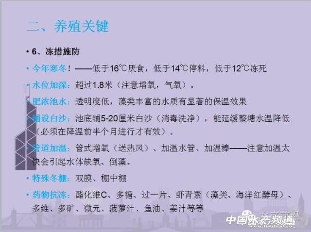 據(jù)說今年是個寒冬,大家要注意水溫測量一天兩次并記錄,低于16℃度,南美白對蝦厭食,低于14℃停料,基本不吃料,低于12℃就有凍死的危險了,但也不是一概而論,不同區(qū)域不同水質(zhì)、鹽度都有區(qū)別,有時水溫低至8度也不死蝦。但是溫度下降時,一定要注意防范有可能出現(xiàn)大問題。當對蝦出現(xiàn)厭食時,要及時控料或停料,不要一味投喂以免壞底壞水引起惡化而中毒死亡。