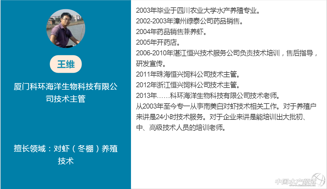 水產(chǎn)頻道公開課堂,分享冬棚養(yǎng)殖技術關鍵點。王維自大學畢業(yè)后一直從事水產(chǎn)工作已有10多年了,尤其擅長對蝦(冬棚)養(yǎng)殖技術并積累了大量豐富的一線經(jīng)驗。那么在短短的2小時,這位實戰(zhàn)派究竟分享了哪些既關鍵實用,且操作可行性高的技術?他對冬棚的硬件條件和養(yǎng)殖關鍵有何獨特的見解?大家不妨來細細回味。
