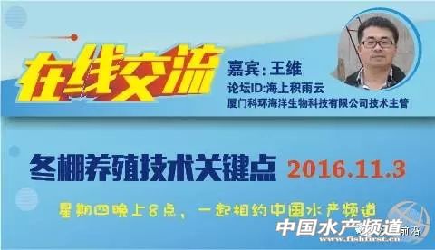 中國水產(chǎn)頻道報道, 11月3日晚上20:00,廈門科環(huán)海洋生物科技有限公司技術主管王維(論壇ID“海上積雨云”)做客中國
