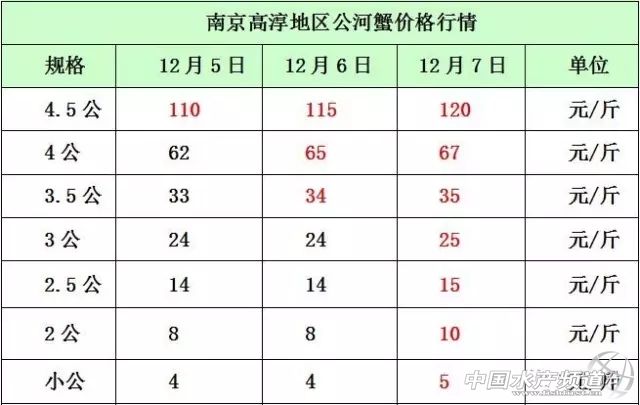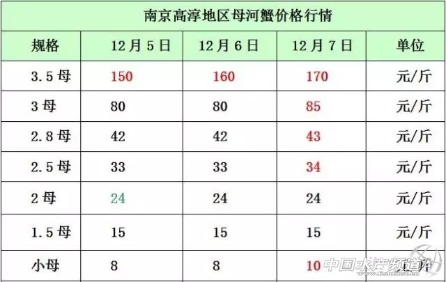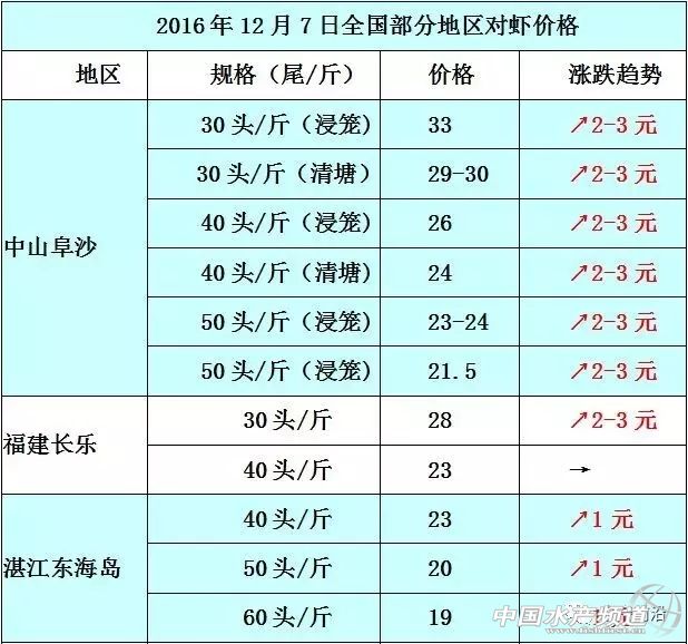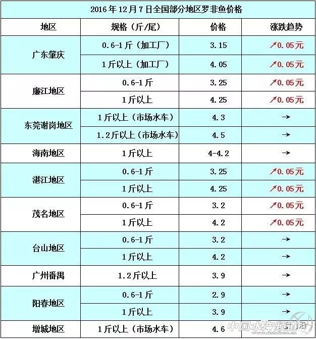 中國水產頻道獨家報道, 雖說近期各地的對蝦市場剛需并沒有增長的跡象,但是可供上市對蝦存塘量日漸減少,特別是30頭或以上/斤大規格的對蝦存量最為稀少,本周各地的對蝦價格都處于平穩的狀態,個別地區因對蝦供應不足,短期內蝦價有所上漲。中山阜沙地區的蝦價相比上周上漲了2-3元/斤,價格漲幅較為明顯;福建長樂地區30頭/斤規格的對蝦價格上漲了2-3元,其他規格的價格暫時保持平穩;湛江東海島地區的蝦價相比上周上漲了1元/斤,廣東珠海地區、廣西北海地區、海南西線地區的蝦價跟上周相比則持平,整體價格無明顯變動。12月7日各地對蝦價格如下: 臨近年底了,各地羅非魚加工廠的外貿訂單大大增長,據悉魚片加工廠的庫存量很多,所以整體的魚價未有大幅上漲。本周廣東肇慶地區的羅非魚加工廠收購價格稍微上調了0.05元/斤;廉江地區、湛江地區、茂名地區的羅非魚塘邊價也全部上調了0.05元/斤,東莞謝崗地區、海南地區等地區的羅非魚價格則保持穩定,價格暫時未有變動。12月7日各地羅非魚價格如下: 12月7日各地河蟹價格如下: