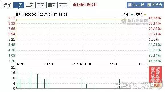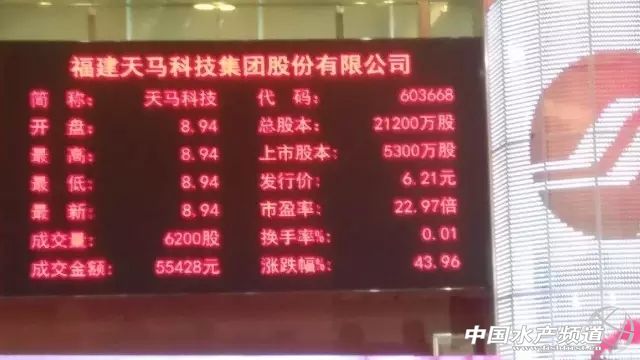 | 文/水產前沿雜志 羅少蒙 中國水產頻道獨家報道,2017年1月17日,福建天馬科技集團股份有限公司(以下簡稱天馬科技[603668])正式上市,發行價為6.21元/股,開盤后迅速拉升至44%,截至發稿前,其報價為8.94元/股,達到上市首日漲幅限制。