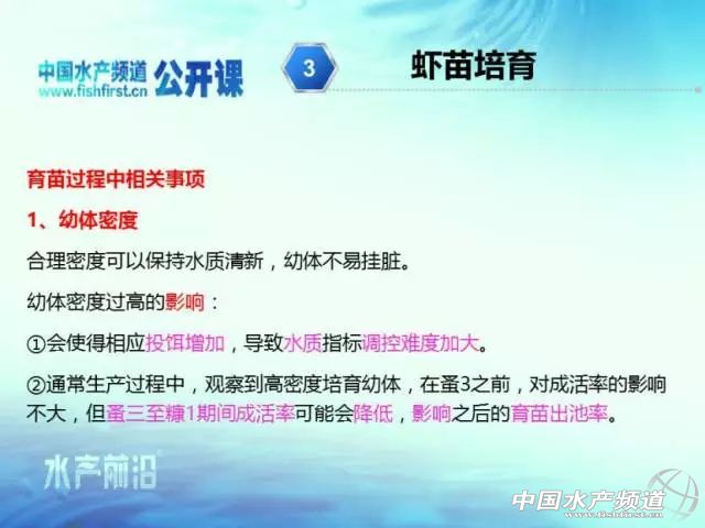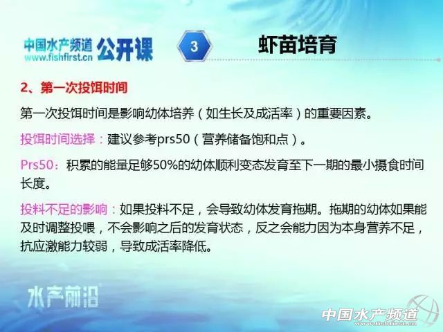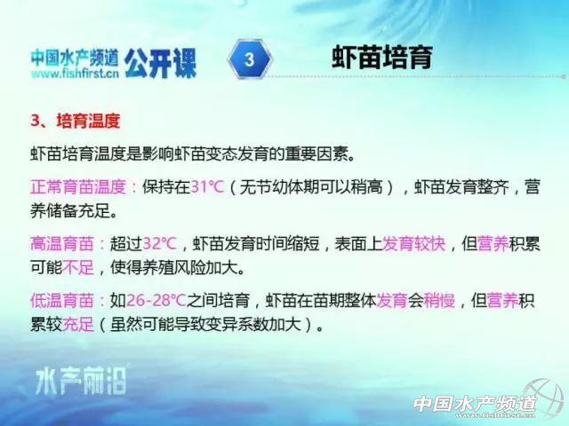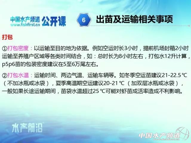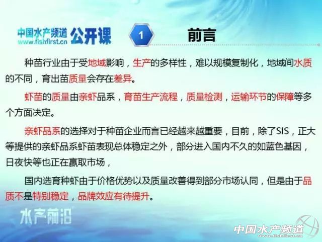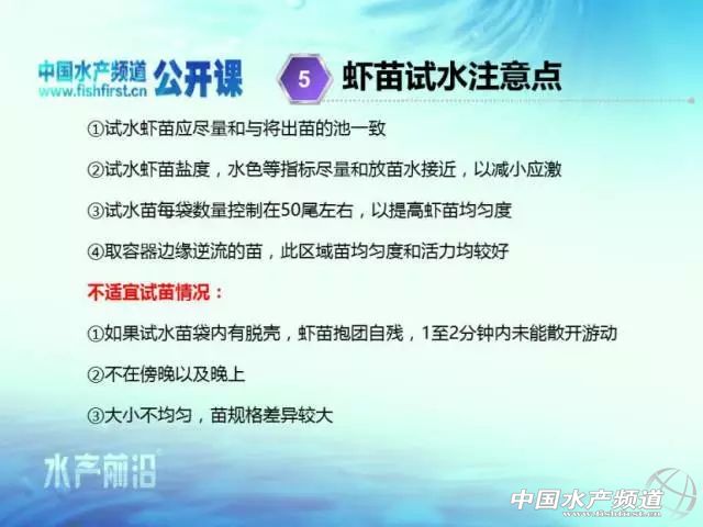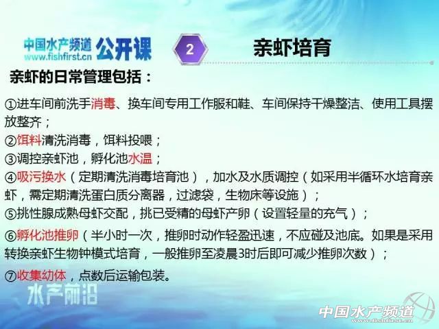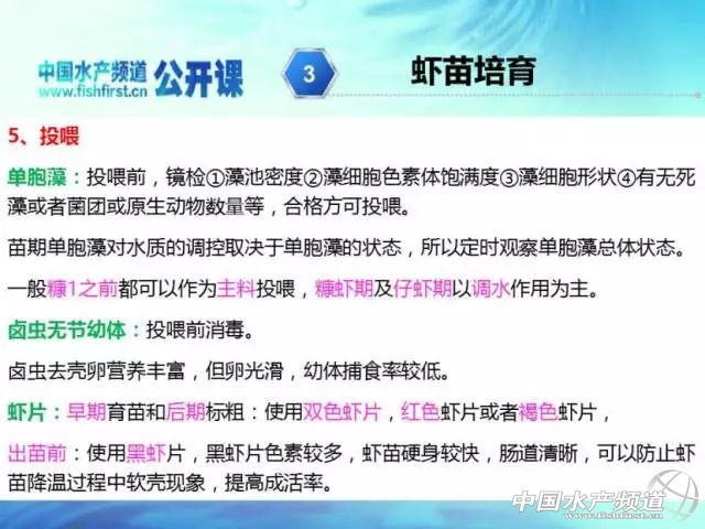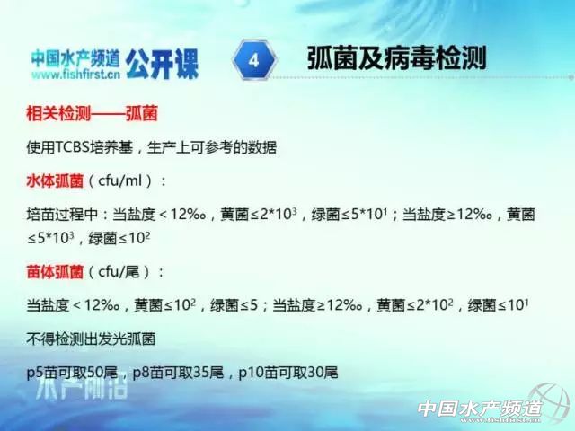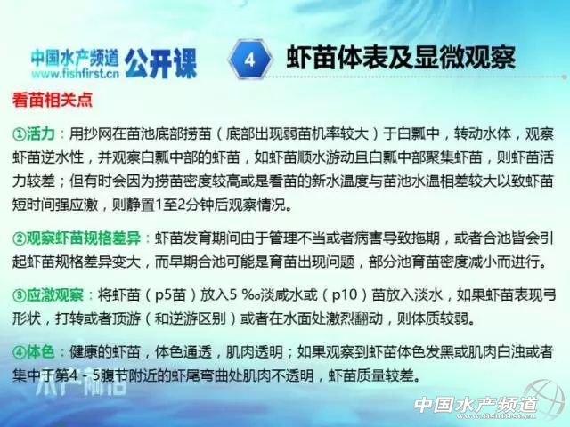 中國水產頻道獨家報道,2017年1月13日晚上19:30論壇資深網友@pl35(原名阮春曉,現任海南勁龍水產種苗有限公司副總經理)做客中國水產頻道公開課課堂,跟大家分享了他在南美白對蝦培育方面的技術分享,主要從前言、親蝦培育、蝦苗培育、蝦苗體表及顯微觀察、弧菌及病毒檢測、出苗及運輸相關事項等6各方面進行了詳細的講解,小編根據錄音進行了整理,現分享給大家。 課程PPT分享 互動與交流 網友:標粗后期氨氮、亞鹽都高,有什么好的降低方法? 阮春曉:綜合投餌、換水率、使用活菌的量和水體改良劑的量(沸石粉)等情況考慮。 ①一般來說控制好蝦苗的投餌量和定時換水,換水是最有效的降解氨氮的方法, ②定期添加芽孢桿菌、光合細菌等活菌和沸石粉等水質改良劑,吸附水體雜質,排水時也可以排出去,而且他們本身也可以促進氮循環,降低氨氮和亞硝酸鹽。 網友:標粗可以用活水嗎? 阮春曉:一般長途運輸以后,前面兩天不換水,因為這時候蝦苗的體質比較弱,如果這時候換水,那么可能會導致體質弱苗的損耗。在這之后建議盡量多換水,因為換水可以改善水質,還可以刺激蝦苗的新陳代謝和淘汰一些弱苗,所以我們在標粗期間如果有合適的水源的話盡量采用換水量比較大的方式來標苗,這樣苗的活力和健壯度都非常好。 網友:請問從蝦苗場運輸蝦苗到養殖場,運輸時間最好是在幾個小時之內? 阮春曉:一般肯定是越短越好,如果是運輸P5、P6的苗,一般最長時間不要超過14個小時,14個小時以內,水質條件都可控。 網友:P5的苗能淡化嗎? 阮春曉:要考慮蝦苗鰓的發育,因為有時候雖然仔蝦已經到了第5天,但是鰓發育可能還跟P5苗不匹配,所以說在有條件的情況下鏡檢蝦的鰓發育是不是已經達到P5階段了,如果已經到達P5階段了就可以降淡,但是P5苗一般苗場出苗的水都是在12-13格之間。 網友:在廣東省,氣溫多少度投苗比較合適?運輸過程中需要做什么保溫措施嗎? 阮春曉:一般水溫維持在22℃以上才能夠投苗。 冬季運輸過程中建議苗袋放在泡沫箱,然后封箱運輸,防止在運輸過程中不可預見的情況。 網友:高溫育苗通常指多高溫度以上?為什么溫度高不好呢? 阮春曉:一般苗池水溫超過32℃就可稱之為高溫育苗。 高溫育苗一般蝦苗的蛻殼速度比較快,但是營養積累不足,這樣就會導致蝦的體質比較差,養殖戶在養殖這種蝦苗的時候風險就會加大。 網友:蝦苗放外塘后,建議一天喂幾餐?喂多大的量? 阮春曉:蝦苗放入外塘的投喂要考慮蝦塘本身餌料豐度,比如說蟲、藻等情況來綜合考慮投餌量,舉個例子,以100萬苗標粗為例,一般一天蝦片的用量在2斤左右。 網友:我們在選擇蝦苗的時候都是去苗場,從他們進過來的無節幼體,一直看到P10,出苗給我們,長速較快的我們就要,太慢的則不要,請問這種選苗方法可取嗎? 阮春曉:蝦苗的生長速度只是我們選苗的一個指標,因為現在選苗要考慮蝦苗本身帶弧菌的量、蝦苗是否攜帶病毒、規格差異度如何和體表的寄生蟲、腸道和肝臟的發育情況等綜合考慮。 網友:相同品系的苗有些看起來胖呼呼的而有些看起來修長,這個是否反應營養狀況? 阮春曉:蝦苗胖和修長只是它體表特征之一,一般來說這兩種苗我們都覺得正常,但是我們要考慮到身體的比例,比如說蝦苗的頭部比較大,身體比較小,這種苗可能就不是太好。 從營養上來說主要是考慮蝦苗的肝胰腺和腸道的狀況,因為這兩個部分才是蝦苗吸收和消化營養的主要器官。 網友:弧菌通常是海水中常見優勢菌,面對檢測出弧菌較多情況是否有必要進一步鑒定? 阮春曉:一般在育苗生產過程中以黃弧菌和綠弧菌的指標做檢測。 黃弧菌指溶藻弧菌和哈維弧菌、鰻弧菌,綠弧菌指副溶血弧菌、河流弧菌等。 如果說黃綠菌超標,在生產上會做相應的處理,包括換水,甚至苗不合格就會做銷毀處理。 鑒定上可能需要更進一步的專業結構來做檢測。因為在生產中所選用的TCBS培養基,它培養出來的并不一定是弧菌,這個是TCBS培養基作為病原鑒定方面的不足。 網友:育苗時投喂的餌料結塊是怎么回事,怎樣處理? 阮春曉:餌料結塊要以下三點: ①餌料的質量,因為有的餌料特別是蝦片質量比較差的話就會導致結塊沉底; ②水質的條件,如果水質管理不善的話會造成水發粘,水發粘之后也會導致餌料結塊。 ③水質返清以后也會出現餌料結塊的現象。 處理:水處理要嚴格按照沉淀消毒,精密過濾處理,確保水質達到育苗標準。育苗過程中,掌握投餌量,以防止水體負載過大。合理使用有益菌,水質改良劑等維持生態系統的平衡。 網友:養殖戶怎么樣才能在淡化標粗廠選到好蝦苗,大部分廠家不讓進車間選苗? 阮春曉:①和標粗場管理人員和技術人員進行溝通,了解他們的育苗理念; ②觀察標粗場的設施設備情況,只有設施齊全完善才能夠育出好苗; ③試苗,試苗也能讓我們間接了解到蝦苗的質量情況。 網友:怎么看粘污這個現象? 阮春曉:要考慮一下幾點: ①水處理,如果前期水處理不到位的話水體里面的原生動物,包括細菌等超標的會造成蝦苗體質減弱,體質減弱之后就會產生粘污現象; ②育苗過程中投餌的情況,投餌過多會導致水質敗壞,造成蝦苗活力減弱,也會造成粘污現象。 ③幼體質量一般,造成發育為蚤狀幼體后活力差,產生粘污現象。 網友:北方地區今年興起,小棚暫養半個月,再分大塘模式,也還不錯,我想在小棚里蓋一個30m