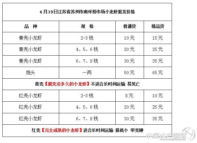 中國(guó)水產(chǎn)頻道獨(dú)家報(bào)道,據(jù)網(wǎng)友提供消息,2017年4月19日江蘇南環(huán)橋市場(chǎng)小龍蝦批發(fā)價(jià)格如下: 江蘇南環(huán)橋市場(chǎng)小龍蝦批發(fā)價(jià)格信息由江蘇省蘇州市南環(huán)橋市場(chǎng)雜魚(yú)區(qū)29號(hào)<君樂(lè)小龍蝦>(電話:13222277503張先生、 17152546669劉先生 微信訂貨:18040020068)提供,由于價(jià)格波動(dòng)及訂貨量影響,以上價(jià)格為收購(gòu)價(jià)格,實(shí)際價(jià)格請(qǐng)聯(lián)系電話。 |