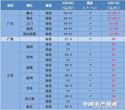 文/圖 鱖鯪行家 徐偉輝、水產前沿雜志 吳佳輝 養好魚,更要賣好魚 全國鱖鯪行情周四見 行情分析及預測 1:本周桂花魚如預期持續上漲,同時預計接下來半個月左右上漲空間有限,這幾天是賣魚好時機。 2:今年桂花魚存塘量整體比去年大很多,后市不怎么看好,規格大的魚要趕緊出手,另外廣東省外市場的價錢是以少量計算的,量大價格也不高,低于廣東的桂花魚價錢,比如江西市場量大的話,標桂26元/斤左右,統桂才不到25元/斤。 3:本周是江蘇市場放鱖魚公分苗高峰期,今年公分苗價格比往年稍有下跌,下周開始廣東省外將有部分養殖戶投放麥鯪水花,目前麥鯪水花2.8元/萬尾左右 公告:本桂花魚價格信息內容計劃從2017年開始收集和發布苗種供應信息,發布的苗種信息會經過嚴格審核,有興趣的可以跟筆者聯系(筆者微信號:13922350546,添加好友是標注:桂花魚+姓名+聯系方式)。 全國桂花魚主要養殖區報價 |