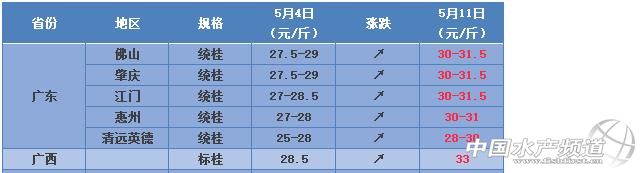 文/圖 鱖鯪行家 徐偉輝、水產前沿雜志 吳佳輝 養好魚,更要賣好魚 全國鱖鯪行情周四見 行情分析及預測 1、廣東市場本周上漲明顯,其他市場也將會陸續跟著上漲,今年5月份賣魚是一個很好的機會點,到了7月份反而不是很看好,因此建議夠大就要賣了。 2、今年標粗的桂花苗不算多,價格目前多在0.14-0.15元/公分,但是今年麥鯪魚粒(1000-10000尾一斤)價格較往年有所升高,目前2000尾一斤的麥鯪在11-12元一斤,5000尾一斤的麥鯪在17-18元一斤。 公告:本桂花魚價格信息內容計劃從2017年開始收集和發布苗種供應信息,發布的苗種信息會經過嚴格審核,有興趣的可以跟筆者聯系(筆者微信號:13922350546,添加好友是標注:桂花魚+姓名+聯系方式)。 全國桂花魚主要養殖區報價 鱖魚公分苗 |