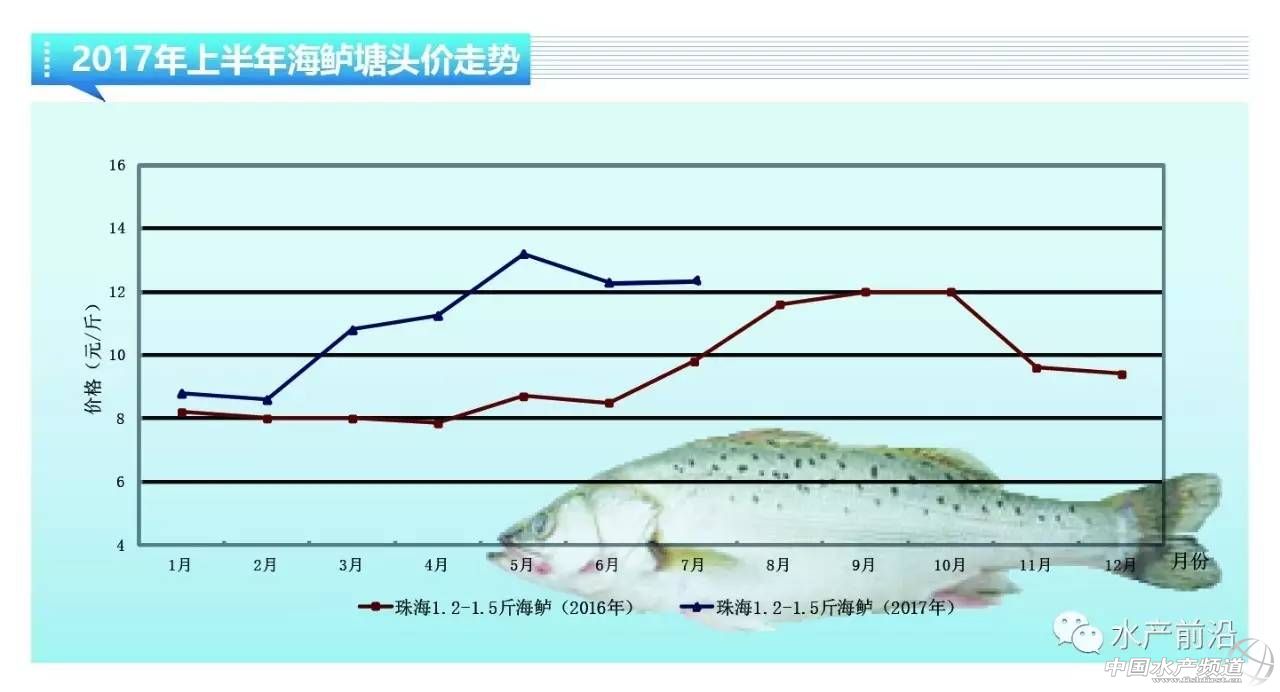 文/圖 珠海強競農業有限公司 海南海王星水產科技有限公司 水產前沿實習編輯 李倩 海鱸:存塘量持續不足,新魚上市前價格將保持穩中上漲 珠海斗門:由于去年受寒潮的影響,海鱸成活率較低,成品魚大部分已經售完,目前主要是以舊魚為主,存塘量較少,2017上半年總體來說海鱸價格堅挺。本周海鱸的價格跟上周相比,大部分規格的價格稍微上漲,除了1.8-1.9尾/斤的價格為11.4元/斤,與上周相比有所下跌。業內人士預測下個星期海鱸價格可能還有0.2-0.3元的漲幅。目前雖然存塘量不足,但市場需求穩定,在9月份新魚陸續上市之前,價格會維持小幅上漲狀態。