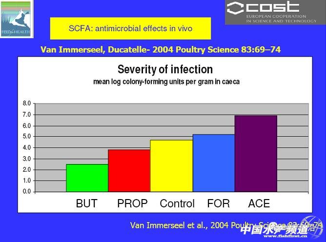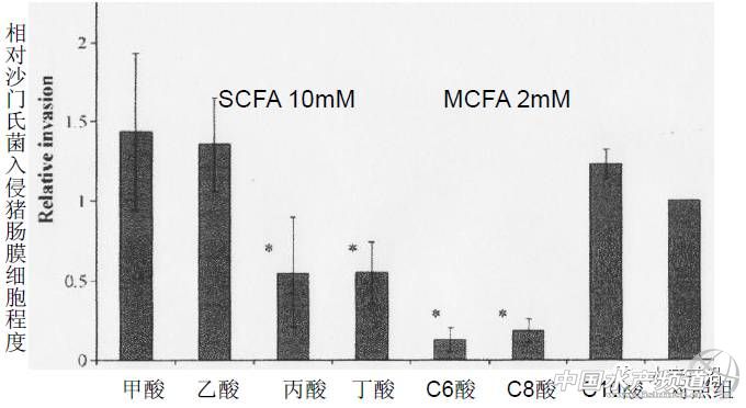 中國水產頻道獨家報道,抗生素因為食品安全及細菌耐藥性問題,其在飼料中的使用越來越受到限制。短中鏈脂肪酸(C1-C14)及其衍生物(脂肪酸鹽及脂肪酸甘油酯)具有廣泛的抑菌效果及其他營養作用,是抗生素強有力的替代品。脂肪酸及其衍生物在抑菌機理和抑菌效果受到碳原子數量和衍生產物類型的影響,并且其在飼料中的應用受到其它因素(飼料加工、胃腸道消化吸收、腸道內pH等)的影響。短鏈脂肪酸(以丁酸為代表)的抑菌作用、營養作用及其他功能性作用(如免疫、腸道屏障等)研究非常充分,但是其在飼料中的應用卻受到了氣味、加工、動物吸收等等方面的限制。隨即出現了脂肪酸鹽、包被脂肪酸及脂肪酸甘油酯。中鏈脂肪酸碳鏈長度在8到14之間,其抑菌機理與短鏈脂肪酸完全不同。中鏈脂肪酸甘油酯是一種非離子表面活性劑,可以直接穿過細菌細胞膜,并成為細胞膜的一部分,從而改變細胞膜的穿透性;同時抑制細菌中脂肪酶(在細菌定植黏膜細胞表面過程中所必須的)的活性。中鏈脂肪酸及其衍生物抑菌效果高于短鏈和長鏈鏈脂肪酸,其最小抑菌濃度比短鏈脂肪酸可低10倍。此外更有研究表明中鏈脂肪酸甘油酯對病毒有很強的抑制作用。本文綜述了短中鏈脂肪酸及其衍生物的抑菌機理和抑菌效果,以期為養殖業應用此類產品提供使用依據。 文/圖 上海亙泰實業集團 朱滔 黃小燕 王根虎 廣東美瑞科海洋生物科技有限公司 虞予 近年來,脂肪酸及其衍生物的抑菌活性也一直受到人們的關注.已有研究表明,脂肪酸及其衍生物可抑制絲狀真菌以及酵母菌的生長,同時也可抑制細菌的生長繁殖。研究表明脂肪酸及其衍生物對常見致病細菌(鼠傷寒沙門菌、單核增生李斯特菌、副溶血性弧菌)存在抑制作用。脂肪酸根據碳原子的多少分為短鏈脂肪酸、中鏈脂肪酸和長鏈脂肪酸。碳原子數為1-6的脂肪酸成為短鏈脂肪酸,也稱揮發性脂肪酸,主要包括乙酸、丙酸、異丁酸、丁酸、異戊酸、戊酸。碳原子數為8-14的脂肪酸成為中鏈脂肪酸,中鏈脂肪酸包括辛酸、癸酸、月桂酸、肉豆蔻酸。短鏈脂肪酸可以被腸道上皮細胞吸收,在腸道中既能作為能量被利用,也能調節腸道菌群平衡。并且短鏈脂肪酸對于維持大腸的正常功能和結腸上皮細胞的形態和功能具有重要作用。中鏈脂肪酸主要存在于椰子油和棕櫚油等植物油中,己酸至癸酸含量在椰子油約為15%。棕櫚油中的辛酸和月桂酸約占55-60%。另外反芻動物乳中含量也高,牛油中含量低于6%。大量研究表明,中鏈脂肪酸可以降低動物消化道和內臟微生物數量以及動物產品受微生物污染的機會。它不僅能夠滅活病菌,還能改變病原體的致病毒性。實驗表明,中鏈脂肪酸有減少梭狀芽胞桿菌和沙門氏菌的毒力,抵抗疾病,減少腸道以及全身病毒的效果。因此本文綜述了短鏈和中鏈脂肪酸及其衍生物的抑菌機理、抑菌活性,為其在動物日糧中的使用提供理論基礎。 1、短鏈脂肪酸 1.1、抑菌機理 游離脂肪酸的一般抗菌活性機理。其中一種廣為認可的假設是短中鏈脂肪酸以它們未解離的形式擴散到細菌細胞原生質內,然后解離,從而導致細胞內酸化(Sun等1998)。較低的細胞內pH可導致細胞內的酶失活(Viegas和Sa-Correia1991),和氨基酸轉運抑制(Freese等,1973)。 圖1-1非電離有機酸抑菌殺菌機理 在偏酸(pH為3-4)的環境,非電離的有機酸可穿入大部分細菌胞膜,有機酸在胞內電離產生氫離子,而導致胞內pH偏低(Russell和Diez-Gonzalez,1998),影響到細菌內生物大分子的功能。為了維持胞內pH呈中性,細菌必需動用能源ATP來運送氫離子到胞外。但此耗能工作終將導致細菌用盡能源而死亡(Guilloteau等,2010)。而酸根離子則有可能影響到胞核內的基因表達,下調其毒性,如侵入腸膜細胞能力。比利時科學家VanImmerseel等(2006)已證明丁酸對沙門氏菌就具有下調其毒性基因表達的效果,而導致沙門氏菌在腸道內的危害大為減弱。由于有機酸滅菌功能主要來自于非解離分子狀態,而解離程度與環境pH值和其本身的解離常數(pKa),所以有機酸抑菌殺菌的效果受到環境酸堿度及其本身的電離特性(pKa)(表1)的影響。丁酸及丙酸的效率應高于甲酸、乳酸和苯甲酸。有機酸的殺菌作用在偏酸(pH=4)環境較偏堿(pH=7)環境強,在pH=4有機酸多以非電離結構存在,因而易于殺滅有害細菌。 表1,有機酸在家禽消化道的結構式與部位的酸堿度有直接關系 1.2、短鏈脂肪酸抑菌效果 表2列出丙酸及山梨酸在電離或非電離分子時對抑制幾種有害細菌生長所需的最低濃度的比較。電離分子滅菌所需的濃度為非電離分子的11到350倍,因而失去了在飼料加工的實用性。由于有機酸必須在偏酸的環境才有較好的滅菌功能,那么在豬的消化道只有胃的pH接近有機酸最佳的滅菌功能。對飼料到達胃之前的滅菌功能不大。據有機酸的消化試驗報告(Bolton和Dewar,1965),大部分(95-99%)乙酸、丙酸及丁酸都在到達小腸之前被吸收入體內(表6),因而不能對小大腸提供顯著功能。有機酸在胃中作為酸化劑的功能也會因為飼料配方中其他原料的中和能力而降低(表4)。即便是有機酸能過胃而到達小腸,其酸化或滅菌功能也會因腸道分泌大量的中和物(碳酸氫鈣或碳酸氫鈉)被大量削減。試驗指出高劑量添加有機酸(1%)也不能顯著降低盲腸的pH值(表5)。這也說明丁酸、丁酸鈉/鈣鹽或包被丁酸即便是能過胃達到小腸,其功能效率也不顯