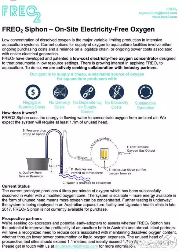 中國水產頻道獨家報道, 編譯/水產前沿 李釩 來源:shrimp news 近日,澳大利亞一家名為FREO2的公司開發了一種新型的生產氧氣的方法,可用于高密度的水產養殖。 早在2015年11月,FREO2就在醫學雜志上發表了關于“SIPHON”氧氣生產系統的簡要報告。該系統當初定位是用于生產醫療級純氧。 2016年,FREO2基金會與Green Camel建立了合作關系,該公司是悉尼西部一個養殖尖吻鱸的養殖場。其合作伙伴Kevin Rassool表示,FREO2的“Siphon”產氧系統為Green Camel提供了比傳統氧氣供應更為經濟、高效、可靠的替代方案。 通過FREO2的網站可以了解到,“Siphon”系統生產氧氣的原理是利用“虹吸”法,通過升高的虹吸管流動的水壓降低來產生真空源,形成真空-壓力-變壓-吸附系統提供動力,并產生醫療級氧氣。 2017年,澳大利亞漁業研究與發展公司向FREO2頒發了特別獎,她是這樣描述“Siphon”氧氣系統的:通過引導自來水通過升高的管道,虹吸管產生真空,這是用于將大氣壓縮到氧氣中的能量。真空通過分子篩擠壓空氣,有效地捕獲氮氣并將其從空氣中除去,所得氧氣純度高達95%。它不使用電力,唯一的持續成本是在5到10年后更換或翻新并不昂貴的分子篩。 這個裝置包含了由低成本的礦物制成的分子篩。當空氣被壓縮并與分子篩接觸時,空氣中的氮優先被吸附,隨著壓力的降低,被捕獲的氮氣再次被釋放,通過如此循環的方式從空氣中除去氮氣。濃縮器通常將兩個灌與空氣壓縮機結合,在壓縮下從一個罐排出氧氣,同時從另一個排出氮氣,通過壓縮和減壓的循環產生純度高達95%,連續流動的純氧。 FREO2的水產養殖業務經理Kevin Rassool轉發了以下文件,其中描述了關于FREO2及其計劃的一些信息: 從以上圖片可以看,FREO2 公司對高密度水產養殖領域非常感興趣,他們的產品已經在醫療領域有應用,現在正在開發水產養殖的市場。他們的目標是為養殖場提供低成本、可持續的供氧解決方案。 目前的產品原型每分鐘能生產4升氧氣,具有很好的溶解性。該系統還具有很強的可擴展性,使產氧效率更高。目前該系統已經在澳大利亞某水產養殖場和烏干達的健康診所進行測試,在市面上還沒有銷售。 另外,FREO2公司也在試圖尋求潛在合作者和早期試驗者,來評估他們的產品是否有潛力提高澳大利亞和海外的水產養殖業的盈利水平的能力。 |