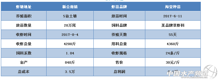 中國水產頻道獨家報道, “55天,24頭!5畝土塘產量4200斤,不到2個月盈利9.1萬!”你可能會列舉無數個不成立的理由,可是真的有人做到了。 文/圖 水產前沿 李釩 廣東新會南鎮德叔,普通5畝土池淡水養殖,6月11日投苗,8月4日收蝦,喂料4360斤,共抓蝦4200斤,不到兩個月輕松盈利9.1萬。德叔的養殖成績一出,南鎮這個珠三角的小村莊又一次為之沸騰,因為這并不是個例,而是常態:德叔采用“快攻”這種完全顛覆主流養殖理念的策略養蝦,已經連續取得10塘蝦成功,盈利近100萬。 德叔(右)的成功絕非是偶然事件 我們先來看一看德叔的養殖數據 德叔養蝦20年,見證了珠三角養蝦業的興衰,在經歷了多年低迷后,德叔也在思考重新調整思路,今年采用了一種與以往完全不同的手法養蝦,簡單說來就是優質苗+低密度+攻料,50-60天結束戰斗的策略,取得了不俗的成績。 “短平快”模式的技術難點就是如何讓蝦快速生長的同時又不發病,這個看似風險很大的策略,已經讓德叔以及他的親戚頗為受益,德叔也形成了一套穩定的養殖管理理念。你可能會覺得不可思議,但是聽了他的介紹,或許會徹底顛覆你對傳統土塘養蝦的觀念。 拋蝦取樣 一、選好苗 德叔指出,選好苗是“快攻”養蝦模式成功的關鍵,而且他只養一個品牌的蝦苗,因為只有摸清楚蝦苗的特點,才能“因材施教”。 “我今年清一色用海壹水產種苗有限公司(下簡稱海壹)的蝦苗,未曾失敗過一次。我現在算是摸清楚海壹蝦苗的習性了,它最大的特點就是生長速度快,規格整齊,抵抗力好。南鎮一帶一般養50天即可達到50-55頭規格,棚蝦養70-80天達到37-38頭規格。我用‘攻料法’55天能養到24頭,如果再養10天肯定能達到十幾頭的規格,說明這條蝦的生長基因是完全沒有問題的! “我只追求好苗,貴一點沒問題,因為苗錢的成本并不高。廣東臺山、廣西現在又開始流行用土苗,我覺得是一種退步,如果苗不好,多好的技術也養不出蝦,這種觀念一定要改變。” 55天長到27克的大蝦 二、低密度 德叔今年另一個改變就是采用“優質苗+低密度”的養殖模式,放苗密度為白水塘3-4萬/畝,冬棚4-5萬/畝。盡管密度比以前降低,但產量和效益卻比以前還要高。據德叔介紹,今年他所有的塘口都是養至35頭以上大規格出蝦,平均畝產1000斤以上,每批蝦養殖周期65天左右,按照這個節奏一年可以養4茬蝦。 “使用“優質苗+低密度”的養殖模式有很多優勢。首先,密度越低則成活率越高,成功率也越高,而且更容易養出大規格蝦,獲得更高的蝦價。其次,低密度可以縮短養殖周期,降低風險,要知道多養一天就多一天風險。最后,養殖時間短可以降低很多成本,比如減少了電費、動保產品的投入。飼料系數也會降低,因為時間短,出蝦快,我今年的飼料系數一般都是0.9左右! 三、穩水質 高投喂量最擔心的是底質惡化,亞硝酸鹽超標,所以穩定的水質是高投喂量的前提。但是德叔的穩水方法也與常人不同:不用菌,只用肥。盡管池塘的淤泥有20公分厚,但他也不洗塘,不改底。 “以前把塘底洗得很干凈反而不好養。塘底有淤泥更容易肥水,藻相也會更穩定。如果經常用化學性底改,還會對蝦造成應激,F在我也不消毒了,消毒很容易造成水變,危險性很高。” “我調水只用肥,不用菌,一般情況下3天追一次氨基酸肥。特別是發現水突然變得很‘漂亮’時,這是水變的征兆,更需要提前補肥預防倒藻。養蝦水夠肥,藻相穩定才能高產,最好是后期形成微濁水(增氧機打起來有點濁)。濁水的池塘產量一般都不會高,一定要注意保持藻類有一定的豐度。” “只要水夠肥,藻相穩定,亞硝酸鹽和氨氮基本不會超標,我的池塘養到后期亞硝酸鹽一般只有0.1左右,這是高投喂量的前提保證! 收蝦現場 四、喂足料 先看看德叔的“攻料法”喂蝦有何特點: 1、使用42個蛋白的優質草蝦料,一天喂2餐,早上6點、下午3點各一餐。 2、投苗后第二天即開始投料,要足量投喂,以投20萬苗為例,10斤/餐(20斤/天),每天增加大概10%,到清罾時大概喂到18斤/餐(36斤/天)。 3、上罾后如轉肝正常,要大膽加料,而且是餐餐加料,一餐加3-5斤,有時一餐加30-40斤,最高峰時20萬苗一餐喂110斤(5.5斤料/萬苗),養殖過程中通常不會減料或停料。 “我對飼料要求高,并不是任何飼料都適合于‘攻料法’。對蝦吃料分兩個步驟,先用前足撿起來,然后再放到嘴里咀嚼,如果飼料的水穩定性不好,時間一長就容易散開。我一天喂2餐,投料間隔時間比較長,這就更求飼料有很好的水穩定性。我現在所使用的飼料浸泡14小時仍能保持很好的形狀,避免了飼料浪費和污染底質! “‘足料法’有3個好處,第一,我曾經聽專家介紹過,南美白對蝦是非常貪吃的動物,而且是雜食性的,如果飼料不夠,就會去吃雜藻、死藻、底泥,這樣一來腸胃肯定會差,導致發病。第二,“足料法”能促進生長,提高體質。第三,減少白便發生機率。因為夠料的情況下減少了攝食雜質的可能,而且蝦的體質強,用這個方法今年我都沒有遇到過白便!钡率褰忉尩。 收蝦現場 五、多增氧 吃料越多,耗氧則越大,只有保持高溶解氧水平,才能滿足對蝦的生長。以5畝塘(1.3米水深)為例,德叔配備了4臺葉輪式增氧機,平均一畝地配1.2千瓦增氧。頭20天開一臺增氧機,20天以后開兩臺,養殖中期開3臺,到最后沖刺階段開足4臺增氧機。同時,在天氣變化時使用增氧劑拌料投喂。 “今年很多人養的蝦出現黑鰓、暗鰓的