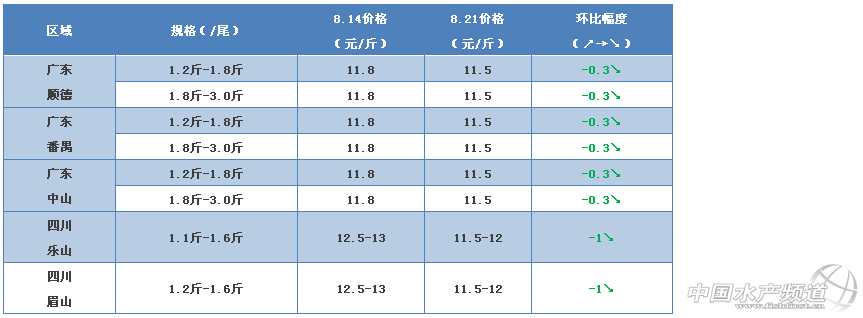 2、四川樂山和眉山兩個地方主要是以新魚為主,1.1-1.5斤規格的出塘價比上周下跌了1元/斤,出塘量不大,預測本周價格還會有小幅的下跌。