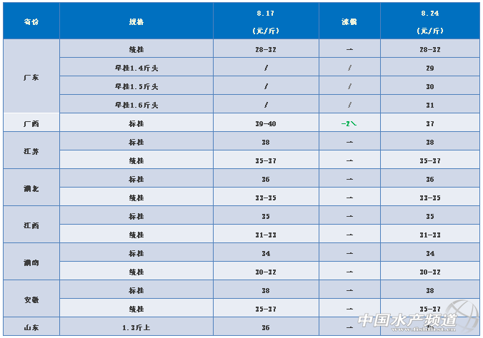 中國水產頻道獨家報道, 鱖鯪行家 徐偉輝、水產前沿實習編輯 李靜 賣魚前撒網打樣,看規格定價 全國行情分析及預測 1:本周桂花魚價格整體保持平穩,現在早桂存塘量不大,廣東省內的晚桂看規格訂價,規格大的價格高一些,還有上漲空間。規格小的甚至低于新魚的價格,很多養殖戶虧本。 2:今年早桂行情確實不錯,同樣規格的魚現在訂魚比早訂魚的價錢更高,往年早桂一般是跑的越快越好,用廣東的話說:跑的快好世界,但今年反過來了。 3:現在100口左右的麥鯪餌料魚肇慶和清遠地區賣2.7-2.8元/斤,處于一個比較低的價位,不過反應現在200-1000口的麥鯪不多了,預計半個月后100口左右的麥鯪會漲價。 4:今年普遍反應養桂花魚的比往年少,養麥鯪的多,導致麥鯪價位不高,比如湖北地區現在200-300口的麥鯪賣3.5元/斤,幾十口的賣2.5-2.7元/斤。 5:本周開始桂花魚基本停止孵化,不打針,公分苗也接近尾聲了,桂花苗也如之前預期的開始升價了,多數賣每公分1毛2到1毛3,后市看漲。 各地區鱖魚本周與上周出塘價對比 【關鍵字】:桂花新魚上市 價格見漲 水產養殖 |