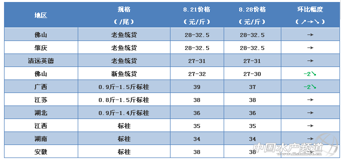 中國水產頻道獨家報道, 文/圖 何氏水產、水產前沿實習編輯 李靜 桂花 1、本周老魚統貨訂魚價格與上周持平:偏大規格訂魚31.5-32.5元/斤,偏小規格訂魚28元/斤。有六成小魚的訂魚價格比新魚還要低,只有25元/斤,這種規格的養殖戶都要虧本。偏大規格的魚市場比較緊缺,而且存塘量不多,后市看漲;偏小規格的魚市場比較充足,價格或會下跌。 2、目前新魚出塘主要集中在三水樂平、高明、中山等地,其他地區的新魚魚頭還比較小。新魚主要看魚頭定價,1.3斤魚頭訂魚價格27-28元/斤;1.5斤魚頭訂魚價格29元/斤;1.6斤以上魚頭訂魚價格在30元,大魚頭價格比上周便宜了2元/斤。 3、廣西、江蘇、湖北、安徽等地老魚存塘量已經不多了,新魚還未達上市規格,出塘量很少,廣西標桂價格下跌了2元/斤,其他地區價格與上周基本持平。 4、因為桂魚出塘區域主要集中在四會、三水、高明,所以桂魚塘頭受“天鴿”和“帕卡”兩個臺風影響不大。 |