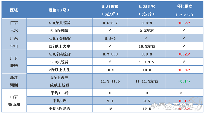 中國水產(chǎn)頻道獨家報道, 文/圖 何氏水產(chǎn)、水產(chǎn)前沿實習(xí)編輯 李靜 生魚 廣東地區(qū)生魚價格持續(xù)上漲,本周與上周相比又漲了0.2-0.3元/斤,4斤多魚頭的統(tǒng)貨價8.8-9.0元/斤,5.0斤魚頭的統(tǒng)貨價9.3-9.5元/斤,這么好的老魚價格為即將上市的秋魚價格奠定了堅實的基礎(chǔ),養(yǎng)殖戶信心倍增。2斤以上大生全國都缺貨,價格也上漲了0.3元/斤,這種態(tài)勢導(dǎo)致魚頭大的塘頭出現(xiàn)裝魚車“排長龍”,供應(yīng)商“搶魚”等現(xiàn)象,估計后期價格還會上漲。中小生規(guī)格本周行情比上周行情有所好轉(zhuǎn),價格持穩(wěn),部分地區(qū)下跌了0.1-0.2元/斤。 |