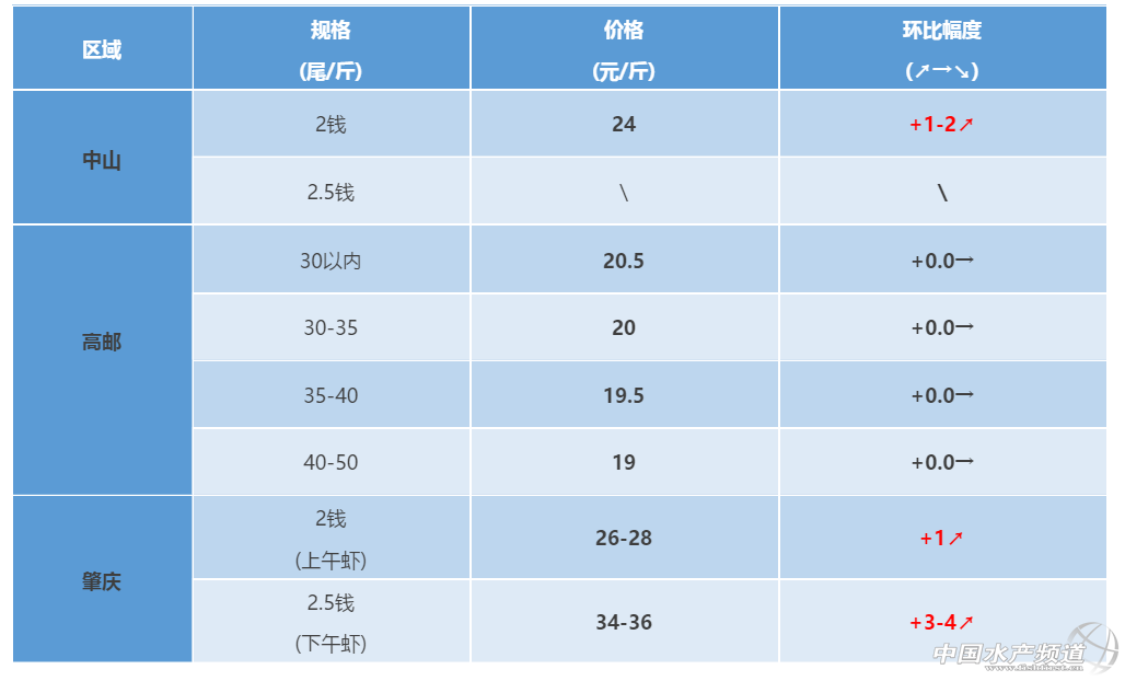 肇慶區域:肇慶蓮塘上午蝦2錢上26-28元/斤,下午2.5錢上34-36元/斤。近期出蝦較少,蝦中收蝦較多,導致近期肇慶市場蝦價上漲,客戶預計在中秋前出蝦,預計蝦價會上漲;肇慶金渡白土,下午蝦兩錢半35元/斤左右,目前大部分羅蝦放苗在40-50天,目前病害主要受臺風悶熱天氣影響導致羅蝦軟殼偷死。