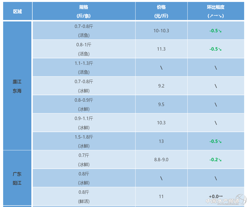 廣西區域:1-3斤的叉尾走凍廠價格價格下跌0.2元/斤,進廠需檢測,要求白肉,無藥殘。叉尾走市場價格與上周基本持平。