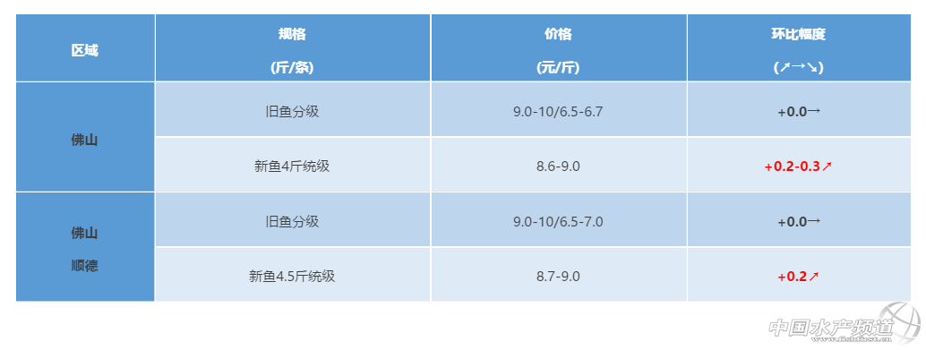 中山區域:當年魚種開始大量出塘,新魚價格高位大幅回落;超市草魚近期市場銷量一般,價格下跌;5斤以上存塘量少價格堅挺。
