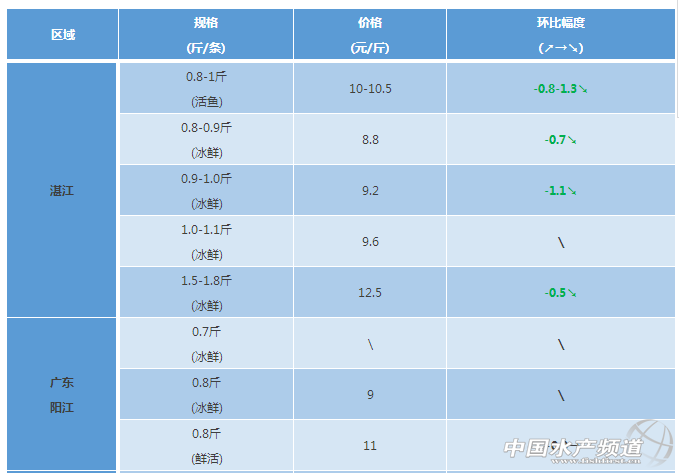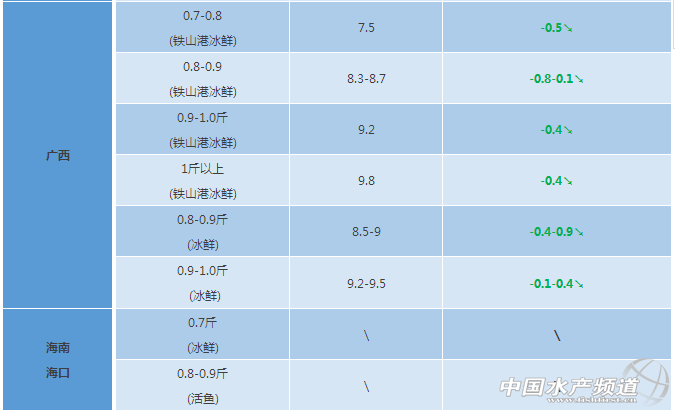 中國水產頻道獨家報道, 文/粵海飼料集團 水產前沿 彭曉君 金鯧魚 湛江區域:該區魚排、深水網箱金鯧魚規格為7兩-1斤/尾,近期東海島東南海區有小瓜蟲,南三海區溶氧低,減料嚴重,個別養戶急于出魚,價格有所下降。 潮汕區域:市場上無成品魚,無價格參考。 廣西區域:受土塘金鯧的大量上市,開禁后海捕海鮮大量上市,養殖金鯧價受到較大沖擊,加上近期病蟲害嚴重,網箱冰鮮金鯧魚價格連續下滑,本周0.8-1斤的冰鮮金鯧下滑0.3-0.6元/斤。凍品與上周基本持平,走量較低。200/300克:8.25元/斤,300/400克:9元/斤;400/500克:10.5元/斤;500/600克:11.5元/斤;600/700克:12.5元/斤;700/800克:12.75元/斤。鐵山港: 價格下降,主要原因是湛江和陽江區域的養戶急于出魚拉低整個市場的魚價。欽防地區現已出魚超過7成,海域養殖密度下降,爆發小瓜蟲的風險較低。 海南區域:目前大部分魚有7兩以上,內灣小瓜蟲爆發,外港沒什么影響。 |