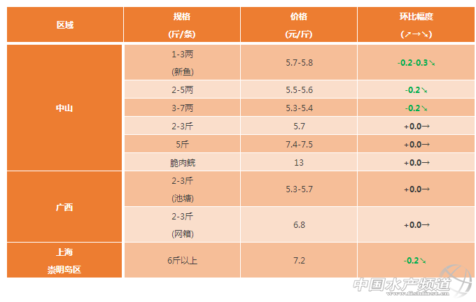 中國水產(chǎn)頻道獨(dú)家報道, 文/粵海飼料集團(tuán) 水產(chǎn)前沿 彭曉君 草魚 中山區(qū)域:當(dāng)年魚種開始大量出塘,新魚價格高位大幅回落;超市草魚近期市場銷量一般,價格下跌;5斤以上存塘量少價格堅(jiān)挺。 廣西區(qū)域:存塘規(guī)格魚數(shù)量減少,近期雨水多、草魚有發(fā)病現(xiàn)象,草魚價格較為平穩(wěn)。 上海崇明島區(qū):近期大量出魚,吃長供應(yīng)量大,魚價下跌;目前小草魚得出血病情況較多,老口魚塘養(yǎng)殖情況穩(wěn)定。 |