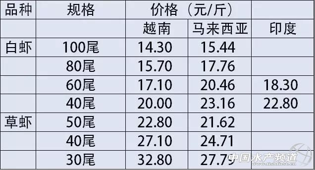 中國水產頻道報道, 文/圖 海鮮指南(seafood-guide) 陳磊 注:以上產品為當地蝦類的塘頭收購價,匯率按2017年9月12日計算,1越南盾兌換0.0003人民幣 本周(9月5日-9月12日),越南草蝦的價格還有輕微幅度的下跌,其中50尾/公斤的草蝦價格同比下降0.2元/斤,目前的價格為22.80元/斤。40尾/公斤的價格為27.1元,比之前的價格下跌了0.3元/斤。30尾/斤的價格比之前下跌了0.3元/斤,目前的價格為32.8元。越南地區(qū)的白蝦價格相對穩(wěn)定,價格波動不大。 印度地區(qū)的白蝦價格有明顯的漲幅,其中60尾/公斤的價格上漲了1.9元/斤,目前的價格為18.3元/斤,40尾/公斤的價格上漲1.8元/斤。 溫馨提示: 以上價格行情由“海鮮指南”統(tǒng)計整理發(fā)布,僅供參考。市場有風險,交易需謹慎 。 轉載聲明 海鮮指南獨家稿件,如需轉載請注明來源。 |