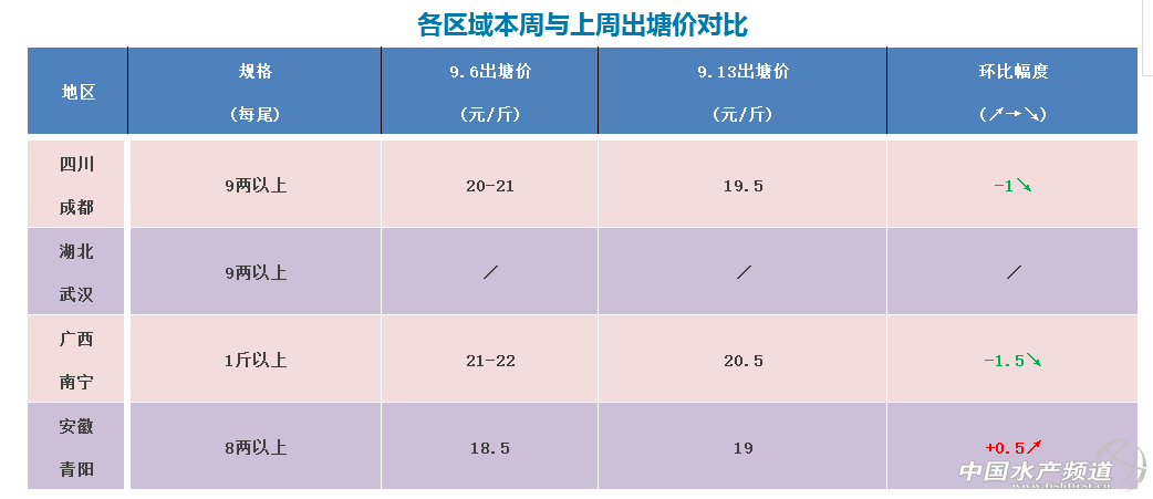 | 中國水產(chǎn)頻道獨家報道, 文/圖 杰大飼料 水產(chǎn)前沿實習(xí)編輯李靜 聯(lián)合發(fā)布 進入九月中旬,廣東地區(qū)加州鱸新魚大量上市,價格明顯下滑。因近來加州鱸新魚跌幅明顯,很多養(yǎng)殖戶著急出魚。考慮到有可能持續(xù)下跌,大部分養(yǎng)殖戶選擇出6兩上規(guī)格,希望能趕個好價錢;一小部分養(yǎng)殖戶選擇出8兩上規(guī)格,提高產(chǎn)量和利潤。也有一小部分養(yǎng)殖戶因這段時間廣東地區(qū)高溫天氣持續(xù),選擇月底出魚。高溫天氣遇到大雨,容易引起翻塘,養(yǎng)殖戶需要注意改底調(diào)水,合理使用增氧機。 四大主產(chǎn)區(qū)行情分析 廣東順德:今天新魚6兩上報價15元/斤,7兩上今天報價15.5元/斤,新魚8兩上18元/斤,但要求有一定規(guī)格的魚頭,1.4斤魚頭左右。 廣東南海:今天舊魚8兩上報價22元/斤,基本已經(jīng)清完。本地新魚上市數(shù)量增多,今天6兩上報價15元/斤,7兩上報價15.5元/斤,8兩上報價19元/斤。 浙江湖州:9兩以上規(guī)格報價是20元/斤。湖州存塘量非常少,基本上沒有什么人出魚。 江蘇吳江:9兩上的報價是20-20.5元/斤。目前吳江的舊魚存塘量不斷減少,隨著吳江地區(qū)存塘量減少,還有北方市場偏愛大規(guī)格的鱸魚,所以最近吳江標魚的價格還應(yīng)該會有所上漲。根據(jù)一些流通商反應(yīng),吳江地區(qū)新口魚估計在9月底有少量可以上市。 四川:報價8兩上19.5元/斤,本周需求量和出魚量都明顯減少。9月11日下跌1元/斤,目前舊魚存塘量較少,新魚大都未到上市規(guī)格,預(yù)計國慶前后會有新魚出。 湖北武漢:還沒有新魚上市,預(yù)計月底才有魚達到上市規(guī)格。 廣西南寧:一斤以上價格20.5元/斤,對比上周有所下降。目前由于氣溫降低,出魚損耗減少,養(yǎng)殖戶出魚熱情明顯上升,預(yù)計接下來價格或持穩(wěn)一段時間。 安徽青陽:8兩以上19元/斤,相比上周上漲0.5元/斤,夠規(guī)格的魚所剩無幾,剩下的月底也會清完。目前新魚普遍4兩左右,基本都是明年才賣。 日常管理小貼示 到了養(yǎng)殖中后期,魚塘的代謝廢物不斷積累,氨氮、亞硝酸鹽也積累到了頂點。有經(jīng)驗的養(yǎng)殖戶會在高溫季節(jié)來臨前,水質(zhì)各項指標還未超標時就開始注重水質(zhì)調(diào)控。“冰凍三尺非一日之寒”,正因為代謝廢物是不斷積累的,所以水質(zhì)調(diào)控也是一個循序漸進的過程,不可操之過急。很多人見到短期內(nèi)無效果便堅持不下去,自然也管理不好水質(zhì)。 |