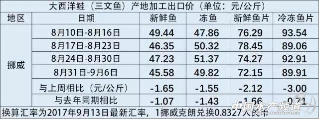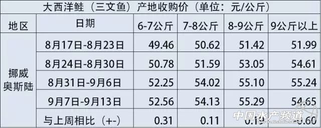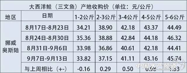 中國水產頻道獨家報道, 文/圖 海鮮指南(seafood-guide) 陳磊 大西洋鮭(三文魚)產地收購價 注:以上產品均已帶頭去臟包裝完畢,質量等級“優質”,匯率按2017年9月13日計算,1挪威克朗兌換0.8327人民幣 大西洋鮭產地收購平均價 上周(9月7日-9月12日),挪威大西洋鮭產地收購價已經連續兩個月出現日此往復變化,上周的價格略有回升,均價上漲1.07元/公斤。其中僅有1-2公斤/條規格的大西洋鮭價格出現了跌幅,其余各規格的價格都有小幅的上升。 兩個月以來,挪威當地的大西洋鮭價格頻繁出現往復變化,可以預計這樣的狀況還將會維持一段時間。 大西洋鮭(三文魚)產地加工出口價 大西洋鮭新鮮魚產地加工出口價 大西洋鮭凍魚產地加工出口價 在大西洋鮭產地加工出口價方面,上周大西洋鮭新鮮魚、新鮮魚片、凍魚和凍魚片的的價格都出現了下降。降幅最大的是冷凍魚片,較上周價格下降3元/公斤。新鮮魚片的價格也較上周下降2.12元/公斤,上周的價格穩定在72.15元/公斤。新鮮魚的價格為近一個月以來最低,價格為45.58元/公斤。 溫馨提示: 以上價格行情由“海鮮指南”統計整理發布,僅供參考。市場有風險,交易需謹慎 。 轉載聲明 海鮮指南獨家稿件,如需轉載請注明來源。 |