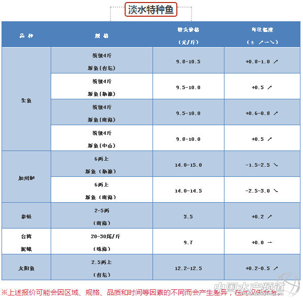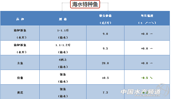 中國水產頻道報道, 流通順暢,價格趨穩 草魚種的價格目前趨于穩定,主要是往外省的流通量逐漸加大,流通比較順暢,后市看穩。統鯇、大草魚和脆肉鯇的價格持續走穩,波動不大,流通順暢。 黃顙魚 供求平衡,魚價持穩 黃顙魚市場出塘魚價維持穩定,雖然市場上大魚存塘不多,但因高溫天氣不便運輸,導致外省車基本不進廣東抓魚,另省外此時有較多魚可出,因此,魚價基本保持穩定。 海水魚 鱸魚舊魚存量少,后市看好 市場鱸魚舊魚所剩無幾,因此魚價處于高位,也導致新魚需求開始增多,具體看魚中與養殖戶議定價格,后市繼續看好。鱸魚新魚符合規格的級魚越來越多,價格趨勢穩定,在舊魚存塘極少且價格居高不下,拉動大規格新魚價格上升(1.2-1.3斤),后續趨勢謹慎看跌。黃花純級魚7.3元/斤,8成中魚8元/斤,不同魚中加減0.1元。中魚存塘較少,后期相對穩定。立魚價格微漲、盲曹價格微跌。 淡水特種魚 大規格生魚嚴重缺貨,拉動統級價格上漲 大規格生魚分級,4斤多頭,2斤上11.5-12.5元,2斤下6.3-6.8元。大規格生魚嚴重缺貨,拉動大魚價格突破12元。大規格生魚價格的帶動下,統級上升0.5元/斤。大魚成數7成左右統級已經發價接近11元/斤。目前市面舊魚偏少,后市價格向好。 |