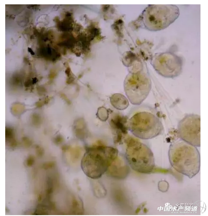 中國水產頻道獨家報道, 本文整理自中國水產頻道第36期公開課,江蘇(廈門)好潤生物科技有限公司大區經理)陳松老師主講的《河蟹養殖后期纖毛蟲的防控措施》 文 /中國水產頻道 周雙艷整理 一、認識纖毛蟲病 纖毛蟲病也就是養殖品種感染了纖毛蟲。 纖毛蟲是具有纖毛的單細胞生物,纖毛是其行動和攝取食物的短小毛發狀的一個小器官。 常見種類:固著類纖毛蟲,蝦蟹身上特別容易固著聚縮蟲、累枝蟲、鐘形蟲等等。 流行情況:蝦蟹養殖全年都能發生,其中以7-11月為發病高峰期,7-11月份正好是絕大部分河蟹池塘的養殖后期,這時河蟹正處于最后一殼蛻殼翻倍拿規格拿產量的關鍵時期,所以說每年到養殖的中后期都需要注重防范纖毛蟲。 這是顯微鏡下觀察到的纖毛蟲:一般都是成簇或者成團的聚縮在一起,外觀上看毛絨絨的。 二、纖毛蟲的危害 危害①:體質差:感染了纖毛蟲的螃蟹體質一般都比較差,固著量比較大的時候河蟹行動緩慢,正常的生理活動受到影響,甚至會出現懶蟹,因為纖毛蟲寄生會讓螃蟹感覺到很癢。 危害②:賣相差:這是絕大部分纖毛蟲帶來的一個危害。全國各地的消費者都偏向喜歡買青背、白板、金爪、黃毛的大閘蟹,但如果養殖后期環境差或者感染了纖毛蟲就會造成螃蟹花底板、黃底板、黑底板,這樣的大閘蟹賣相比較差,使得零售價格偏低。 用洗蟹粉或者用其它的方法清洗大閘蟹也會造成二次損傷,大閘蟹出水之后非常嬌嫩,它經受不起這么多工序對它的折騰。 危害③:輕微固著時,螃蟹身體瘙癢,易上網上岸,影響正常的生長。 我們往往會發現纖毛蟲高發的池塘白天看到很多大閘蟹吊在網上或者留邊上岸。很多人不明白了,他認為是缺氧,其實并不是缺氧。輕微的固著纖毛蟲對螃蟹形成了瘙癢,螃蟹通過爬上岸曬太陽的方式,能夠有效的把纖毛蟲曬死。 危害④:大量纖毛蟲固著: 體表:形成厚厚的一層,嚴重影響螃蟹正常的蛻殼; 眼部:纖毛蟲太多了以后它滿身附著,連眼睛也會附著上,造成螃蟹的眼睛不能進行正常的收縮轉動; 附肢:全部掛滿纖毛蟲,會影響螃蟹正常交配及掛卵; 鰓部:固著纖毛蟲多,會造成爛鰓甚至窒息缺氧。 我們看到很多大閘蟹白天上網上岸,甚至24小時的上網上岸時,就要考慮是否有纖毛蟲固著在螃蟹的鰓部造成螃蟹的窒息,它不是池塘缺氧,而是窒息。 三、什么樣的環境易滋生纖毛蟲? 通過多年的養殖一線的走訪調查以及仔細的研究發現,以下池塘容易導致纖毛蟲的高發: 第①種:底質差,底部比較臟的池塘。 高溫天氣,由于池塘管理不善造成水草腐爛或其它植物腐爛,比如說青苔的腐爛,沉在池底導致底差; 高溫期,河蟹養殖投喂量從中后期開始不斷增大,投喂不合理也會造成池塘底部殘餌糞便積聚過多導致底差; 很多老塘底的池塘底層淤泥比較多,淤泥多也形成非常差的底質。 底差為纖毛蟲提供繁殖的條件。 第②種:水質濃綠或者渾濁的池塘。 水質濃綠為纖毛蟲提供了天然隱蔽的條件, 水質濃綠或者渾濁往往也說明水體里面有機質和懸浮物質比較多,這是纖毛蟲非常喜愛的環境,越臟的地方越容易生蟲。 第③種:草少或者沒有草的池塘。 河蟹養殖中水草的管理是非常重要也非常關鍵的工作。 很多池塘在高溫天氣水草沒有保住,到中后期池塘沒有草了,水草不能為池塘提供凈水功能,水質和底質長期得不到改善,自然而然就會造成惡劣的水質和底質條件。 經過對很多池塘的跟蹤調查發現,幾乎所有沒有水草的池塘或者水草比較差的池塘都多多少少出現纖毛蟲病,只不過是輕重的問題,而水草非常好的池塘尤其長勢比較旺盛的池塘在中后期纖毛蟲爆發的概率極低的。 不同種類的水草爆發纖毛蟲的情況也不同,以泗洪地區河蟹池塘為例: 在當地以伊樂藻為主的池塘,到中后期如果伊樂藻長勢比較旺盛、數量比較多,池塘水質條件比較好,比較清爽的池塘,幾乎看不到纖毛蟲病; 如果以蘆葦藻類為主的池塘,到中后期盡管水草數量很多,活力很好,但是因為蘆葦藻類的凈水能力比較差,依然能夠發現大量纖毛蟲感染的情況。 水草的多少和有無通常指的是像伊樂藻、輪葉黑藻、苦草這一類的水草越多越好,它凈水能力越強越好。 第④種:長期投喂冰鮮魚的池塘。 冰鮮魚或者鮮魚是高投入高流出,利用率極低。有些養殖戶會說我喂的都吃掉了啊,利用率很高呀!我們來算一筆賬,假如說每天投喂了100斤鮮魚,在理想狀態下,這100斤的鮮魚都被螃蟹吃掉了,那這時螃蟹的轉化率大約是多少呢?通常在養殖環境比較好的情況下,大約喂8-10斤的鮮魚能夠出1斤螃蟹,喂到2斤左右的飼料出1斤螃蟹,這是一個大概的餌料系數,那也就意味著每天給池塘里面補充100斤鮮魚的同時,最終會有80-90%的鮮魚會轉化為殘餌糞便存在池塘里面。所以說越到中后期鮮魚或者冰魚的投喂量大往往螃蟹排出來的廢物殘餌糞便會更多,對底層的污染也會更重。 這里還要提一下,絕大部分池塘長期投喂鮮魚或者冰魚對螃蟹消化系統來講是一個非常大的負擔。如果長期吃這些動物性餌料,你會發現這個池塘的螃蟹得腸炎的概率比較高,從而對于動物性餌料的吸收利用率會更低,也就意味著冰鮮魚喂得多,排得會更多,殘餌糞便會更多,長此以往對環境造成的負擔是不言而喻的。這是養殖后期人為的給池塘增加纖毛蟲爆發概率的非常重要的方式。 這四大方面歸根結底就是一個