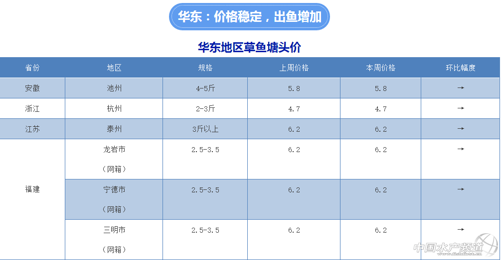 中國水產頻道獨家報道, 養得好,不如賣得好 全國草魚行情解析, 中國水產頻道與您相約每周二 文/水產前沿 鄭鵬飛 進入黃金周以來,草魚消費量明顯增加,部分地區流通量增加到之前的2倍以上。但是,同時受到十一高速堵車的影響,很多魚車被堵高速幾十個小時,損失慘重。一些有流通商選擇干脆十一不抓魚。據了解,廣西地區抓魚的有明顯減少,而福建地區賣魚明顯增多,很大程度上受消費市場以及交通情況影響。全國大部分地區草魚行情保持穩定,價格基本維持在上周水平。 方威供圖 廣東:本周珠三角魚價基本穩定,大部分地區保持在上周水平。對于是否會漲價,一些人表示不好說,預計上漲難度大。 廣西:有業內人士表示,最近廣西地區價格維持不變,欽州地區10月1-3日拉魚的減少了很多。目前港南2-3斤5.8元/斤,橫縣和金陵地區2-4斤規格網箱草魚塘頭價保持上周水平,塘頭報價5.7元/斤。 江西、湖南、湖北:受到十一交通堵塞影響,草魚流通受阻嚴重。據了解有魚車被堵在路上幾十個小時,氧氣供應不上,損失慘重。目前整體上華中地區草魚價格穩定,價格維持上周水平。 河南:據司寶強反映,本周河南開封等地草魚價格保持穩定,目前2-4斤草魚塘頭價為5.3元/斤。 安徽、浙江:本周這兩個地區的草魚價格基本都保持在上周水平。 福建:業內人士表示,目前福州地區小魚多大魚少,行情不好,沒有上漲。不過,澳華劉經理表示,福建地區整體草魚消費量增加,養殖戶表示賣魚好賣很多,出魚量大大增加。 貴州、重慶:貴州遵義地區本周3斤左右草魚價格稍有下跌,較上周下跌0.1元,目前報價6.8元/斤。地區之間草魚價格差異較大,貴州部分地區3斤的草魚目前也有8-8.2元/斤的好價格。 北京、天津:北方地區近期草魚價格也基本保持穩定,不過受到黃金周消費刺激,出魚量有所增加。 |