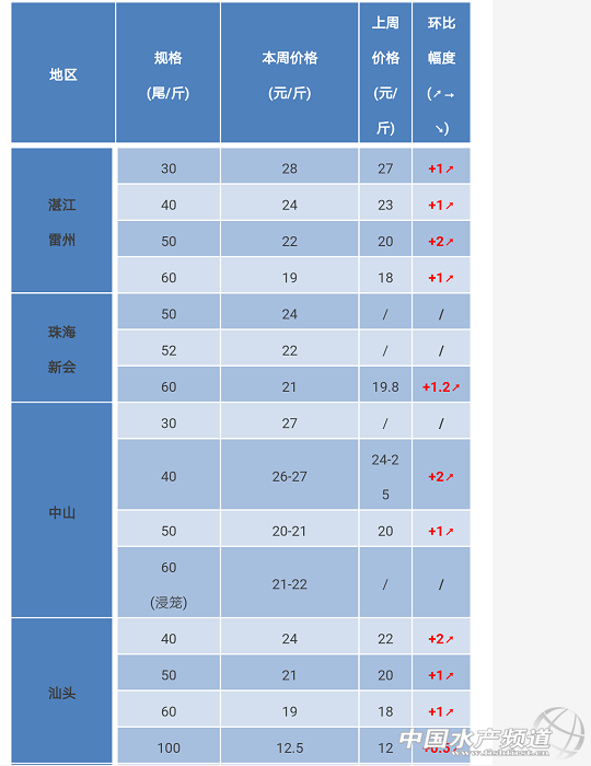 文/粵海飼料集團、中國水產頻道 彭曉君 各產區白對蝦一周價格分析 中國水產頻道報道,湛江、海口:受國慶中秋節假日影響,本周蝦價繼續上漲,中造蝦養殖相對較穩定,市場需求強勁,后市穩中略跌。 珠海新會:國慶、中秋價格不穩定,有部分收蝦的特意多租幾輛水車增加蝦走量“博價”。不同蝦中收蝦相差2-5元/斤。整體上,較上周上漲2元/斤左右哦。 廣西北海:蝦價格在國慶、中秋期間上漲的幅度并不如人意,甚至出現了由于國慶中秋假期間堵車,鮮活運輸風險增大而引起價格波動,部分規格甚至不升反跌的情況。目前國慶、中秋佳節已過(活鮮一般是在節慶前2-3天開始抓蝦運輸暫養來應市),出現各規格蝦呈漲跌不一的現象,30尾/斤規格與上周持平,40尾/斤較受歡迎,比上周漲1元/斤,50尾/斤價格與上周持平,60尾/斤比上周下跌0.5元/斤,整體震蕩波動較大。按往年經驗節后蝦價會有所下滑,但鑒于目前存塘規格蝦非常少,估計蝦價下滑的可能性或下滑幅度不大,應該會保持整體堅挺,局部波動。今年晚造蝦養殖狀況比早造要好的多,在晚造蝦大量上市的10月底、11月初之前,價格都會因為蝦少而比較堅挺。 中山:中山南朗40尾27元/斤,東升沙朗50尾20元/斤,中山南40尾26元/斤,港口40尾26元/斤,50尾浸籠24-25元/斤,60尾浸籠21-22元/斤,東莞40尾28元/斤;中山南預計中秋過后存塘較少,10月份開始逐漸進入冬鵬蝦準備階段,南朗中秋過后,大蝦基本出完,港口三角現階段市場白蝦大部分在80尾/斤左右。 汕頭:土塘存塘蝦規格主要在40-80尾/斤左右,40尾/斤以上大規格蝦少。土塘養殖情況不佳,收蝦量少,蝦價同比上周上漲2-3元/斤。小規格蝦仍然保持較好價格。 漳州:高位池蝦養殖80%放苗一個月以內,無大規格存塘蝦;土塘存塘蝦規格主要在40-70尾/斤左右,40尾以上大規格蝦少。本周蝦價同比上周上漲2-3元/斤。 上海:出蝦正常,養殖接近尾聲。 浙江紹興:養殖基本結束,開始清塘。 江蘇如東:外塘養殖情況良好,氣溫變低,大棚蝦開始發病。 山東濰坊:土池已經結束,大棚剛放苗。 10月6日全國主產區白蝦塘頭價格 【關鍵字】:對蝦 對蝦價格 對蝦養殖 |