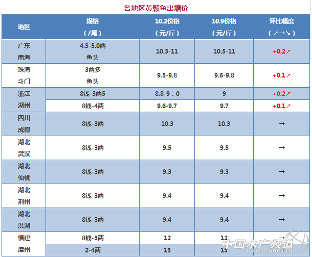 中國水產頻道獨家報道, 黃顙魚 廣東地區上周黃顙魚價格波動不大,塘頭價還是根據魚頭大小來定。這兩天市場上一些規格的價格有下滑的跡象,整個雙節期間黃顙魚的銷量變化不大。浙江湖州雙節期間銷量比節前增長,價格穩定。其他地區價格與上周持平。 |