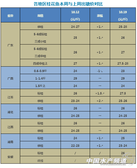 中國水產(chǎn)頻道報道, 文/ 水產(chǎn)前沿 李靜 養(yǎng)好魚,更要賣好魚 全國鱖鯪行情每周見 全國行情分析及預(yù)測 本周廣東桂花魚持續(xù)上升,近日訂魚基本在27-28元/斤,與去年同期22.5元/斤的價格相比,今年桂花魚價格高5元/斤!考慮可能有今年廣東6月份桂花魚苗出現(xiàn)問題較多而導(dǎo)致現(xiàn)在存塘減少的原因。 目前當(dāng)?shù)毓鸹~出塘量較大,一定程度上減少了廣東鱖魚的供應(yīng)量。如江西市場,目前廣東主要供應(yīng)的是8兩以下的鱖魚,接貨價為24-25元/斤。 桂花苗:市場基本結(jié)束,往年這個時候還有比較多的1-2兩的桂花苗,今年卻是重金難買,一苗難求,預(yù)計桂花魚后市價格或?qū)⒈容^可觀。 餌料魚:清遠(yuǎn)100尾/斤左右的麥鯪3.3-3.4元/斤、四會大沙3.2-3.3元/斤、江門3.5元/斤、佛山3.2元/斤、肇慶3.2-3.3元/斤、花都3.5元/斤、湖北3.5-4元/斤、南寧3元/斤、湖南衡陽3元/斤。巴西鯛2.1-2.2元/斤。 【以上數(shù)據(jù)及行情分析僅供參考】 |