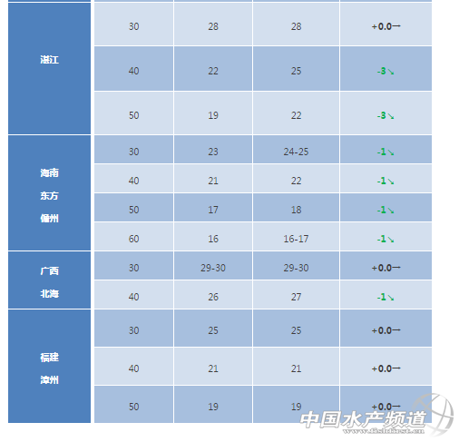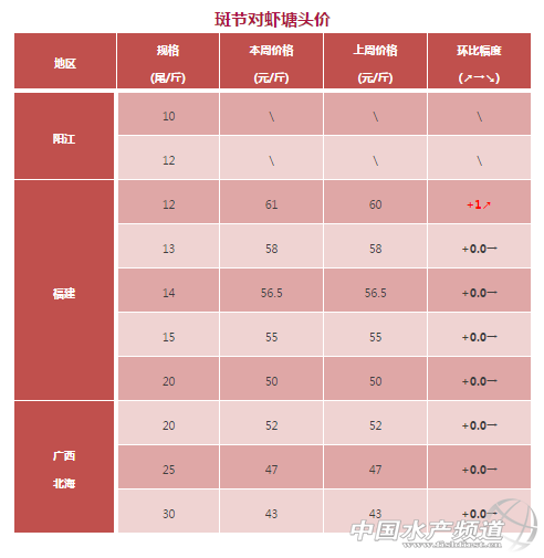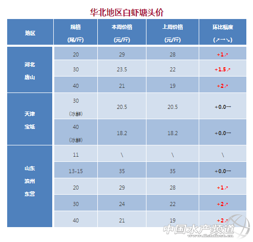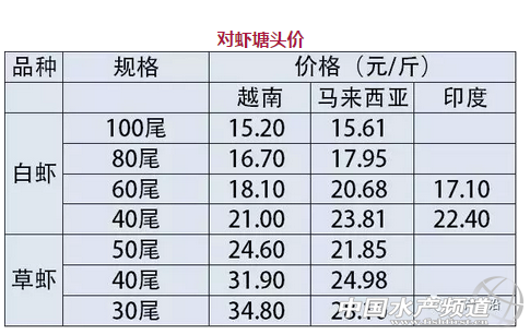 中國水產頻道獨家報道, 文/水產前沿 彭曉君 + 南方白對蝦:高位池紅體病爆發 華南地區白蝦塘頭價分析 珠海、新會:羅蝦逐漸清塘,準備進入冬棚模式,價格上漲阻力較大,目前珠三角白對蝦價格沒有什么變化。 廣西、湛江:近期蝦塘發病增多,湛江地區紅體病爆發,病蝦上市沖擊了蝦價,價格有所下滑。 福建:當地大部分開始準備冬棚養殖,清塘出蝦量增加,蝦價繼上周回落后本周維持穩定。 華東地區白蝦塘頭價分析 江蘇如東:目前小棚蝦開始出售,主要規格在60-100頭,價格較外塘低1-2元。外塘蝦已經接近尾聲,目前價格相對穩定。 浙江:由于外塘蝦養殖接近尾聲,活水蝦價格較好。加上晚造大棚開始較晚,加上目前的大棚效果一般,所以大棚出蝦不多,外塘活水蝦價格繼續看好。 北方白對蝦:存塘大蝦少,蝦價略有上升 河北唐山:本周活蝦價格上漲2元,冰鮮蝦維持原價但是受活水蝦漲價影響幾乎沒有養殖戶賣冰鮮蝦!據了解,目前北方的工廠化蝦很少,目前投苗的也有很多排糖,預春節前才會上市。 天津寶坻:預計報完這次價格,下周基本就沒有外塘蝦了,一些大棚已經開始準備投苗。據天津海大陳梁斌介紹,目前河北地區“外塘結束,大蝦稀缺,蝦價低迷”,剩下的蝦摟底拋售,有錢就賣。目前70頭的10元/斤,60頭的11元/斤。 山東:本周東營、濰坊、濱州的土塘已經接近尾聲,預計月底即將結束。由于目前出售的多是狀態不好的蝦,所以價格只是小幅上漲。如東地區的下需要等半個月后才陸續上市,預計價格大幅拉升還需要一段時間。 東北、西北地區白蝦塘頭價分析 遼寧營口:營口外塘蝦也已經基本結束,由于環保限制,工廠化市場會嚴重缺蝦,預計今年蝦價會遠遠高于往年同期。 東北、西北地區白蝦塘頭價 斑節對蝦 斑節對蝦塘頭價分析 陽江:本周斑節對蝦價格沒有什么變化,目前存塘不多,大部分養殖戶準備搭冬棚養殖南美白。 斑節對蝦塘頭價 東南亞對蝦:蝦價穩定或上漲,波動不大 蝦價分析 本周(10月11日-10月16日),越南白蝦和馬來西亞白蝦在本周價格保持穩定,印度地區白蝦價格有小幅上漲。其中60尾/公斤的草蝦價格同比上漲0.8元/斤,目前的價格為17.1元/斤。40尾/公斤的價格為22.4元,比之前的價格上漲了1.5元/斤。 根據越南媒體報道,今年前8個月越南出口美國白對蝦市場份額為41.6億美元,比去年下降4.4%,但是對中國、日本、巴西和東盟的貿易額有明顯增加。目前美國在越南白對蝦出口額已經從2006年的第一降到第四。 印度白蝦出口數據相對好看很多,根據印度海洋產品出口發展局(MPEDA)的數據,截止今年6月份,印度白蝦出口量增加25%,出口產值增長16%,其中凍蝦貢獻做大。 對蝦塘頭價 注:以上產品為當地蝦類的塘頭收購價,匯率按2017年10月17日計算,1越南盾兌換0.0003人民幣 溫馨提示:東南亞國家對蝦塘頭價格行情由“海鮮指南”統計整理發布,僅供參考。市場有風險,交易需謹慎 |