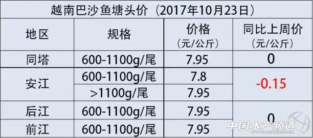 中國水產頻道獨家報道, 文/圖海鮮指南(seafood-guide)陳磊 越南巴沙魚塘頭價: 注:以上產品為越南當地巴沙魚塘頭收購價,匯率按2017年10月23日計算,1越南盾兌換0.0003人民幣 本周(10月17日-10月23日),越南巴沙魚原料價格在經過一個多月的行情上漲之后,首次出現小幅的回落。此次價格下降出現在安江地區,600-1100g/尾和大于1100g/尾的巴沙魚原料都出現了價格的下降,但是下降幅度不大,每公斤僅下跌了0.15元。其余各地區的巴沙魚原料價格均保持不變。 預計在接下來的一段時間內,巴沙魚的原料價格將維持在這個水平,直到11月中旬,美國和歐洲的訂單確定之后,市場的供求關系將會再次影響巴沙魚塘頭價格的變化。 越南羅非魚塘頭價: 注:以上產品為越南當地羅非塘頭收購價,匯率按2017年10月23日計算,1越南盾兌換0.0003人民幣 越南地區的羅非魚價格一直都維持在相對穩定的水平,各規格的價格波動較小。本周僅有紅羅非和600-800g/尾的黑羅非有輕微的價格上漲,其余各個規格的羅非魚價格不變。 溫馨提示: 以上價格行情由“海鮮指南”統計整理發布,僅供參考。市場有風險,交易需謹慎。 |