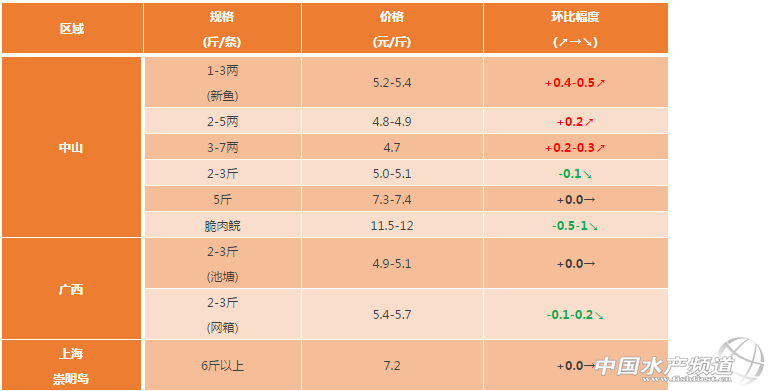 中國水產頻道原創報道,中山區域:魚種價格反彈,超市草魚近期市場銷量一般,價格低位,5斤以上存塘量少價格堅挺。