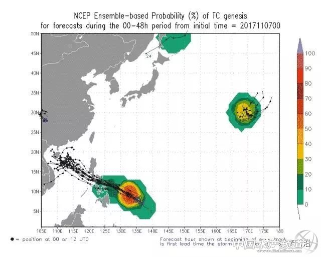 NCEP集合預(yù)報11月7日08時預(yù)測的未來兩天西北太平洋臺風(fēng)生成概率,菲律賓東部洋面再度成為焦點