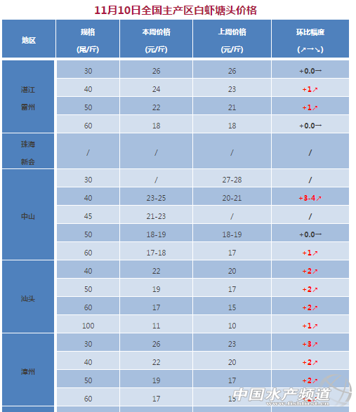 中國水產(chǎn)頻道獨家報道, 文/粵海飼料集團、中國水產(chǎn)頻道 彭曉君 各產(chǎn)區(qū)白對蝦一周價格分析 湛江、?冢罕局芪r價小幅上漲,打水車價格較高。目前抓冰蝦較少,冬蝦養(yǎng)殖開始,后市穩(wěn)中有漲。 珠海新會:本周暫停報價。存塘蝦很少,出蝦少,存蝦溫度低吃料和長速放慢,但病害不多。養(yǎng)殖冬棚蝦的普遍在整塘、蓋冬棚,很個別的開始放冬棚苗。 廣西北海:近期因為冷空氣影響,存塘規(guī)格蝦大幅度減少,大規(guī)格蝦量少價漲,中規(guī)格蝦價格持平或略有下跌。目前存塘的規(guī)格蝦大多是發(fā)過病留來繼續(xù)養(yǎng)的,加不上料,產(chǎn)量也比較低,有些近十畝的塘都抓不夠一活鮮車,在一定程度上也影響價格。整體成交量較低,價格波動震蕩較大。 中山:中山南朗45尾21元/斤,東升沙朗50尾18元/斤,中山南50尾19元/斤,港口40尾23元/斤,阜沙東鳳45尾23元/斤,魚窩頭40尾25元/斤,順德均安40尾26元/斤,60尾18元/斤;中山南受天氣影響,蝦吃料普遍較慢,病害較多,主要應激、紅須、紅尾等,養(yǎng)戶出蝦意愿較強,出蝦普遍在50-60尾/斤;東升沙朗處于冬棚搭建階段;南朗受水溫影響,對蝦吃料較慢,其他地區(qū)溫度低,吃料慢,長速相對較慢。 汕頭:土塘存塘蝦規(guī)格主要在30-70尾/斤左右,40尾以上大規(guī)格蝦少。土塘養(yǎng)殖情況不佳,近期氣溫下降,土塘抓蝦量增加。本周蝦價同比上周上漲2-3元/斤。 漳州:高位池蝦養(yǎng)殖80%放苗一個月左右,無大規(guī)格存塘蝦;土塘存塘蝦規(guī)格主要在30-60尾/斤左右,隨著溫度下降,出蝦量逐漸減少,本周蝦價有明顯上漲,同比上周上漲2-3元/斤。 江蘇如東:價格總體呈下調(diào)趨勢,比上周下調(diào)2-3元/斤,主要因為近期降溫,小棚蝦病害多發(fā),出蝦量增加,且北方遠距離運輸水車還沒到,導致價格下跌。 。ㄉ虾!⒄憬B興、山東濰坊地區(qū)白蝦基本養(yǎng)殖結(jié)束,暫停報價。) 【關鍵字】:對蝦 價格 水產(chǎn)養(yǎng)殖 |