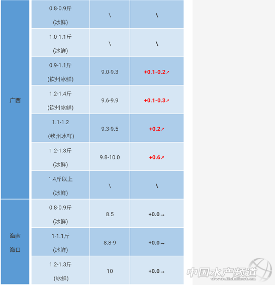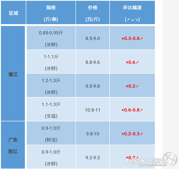 文/粵海飼料集團、水產(chǎn)前沿 彭曉君 中國水產(chǎn)頻道原創(chuàng)報道,陽江區(qū)域:閘坡馬尾一帶出現(xiàn)蟲害、減料、浮頭等現(xiàn)象。 廣西區(qū)域:欽州港大中型養(yǎng)殖戶的魚基本賣完。迫于水質惡化及缺氧、病害等影響及飼料廠資金缺口的壓力,前段時間養(yǎng)殖戶大量抓魚入凍廠,目前金鯧魚存量較低,本周金鯧價格有少量上漲。凍品報價200/300克的8元/斤;300/400克的8.75元/斤;400/500克的10.25元/斤;500/600克的11.25元/斤;600/700克的11.75元/斤;700/800克的12元/斤。 海南區(qū)域:存魚客戶處于觀望狀態(tài),都不想賣。 |